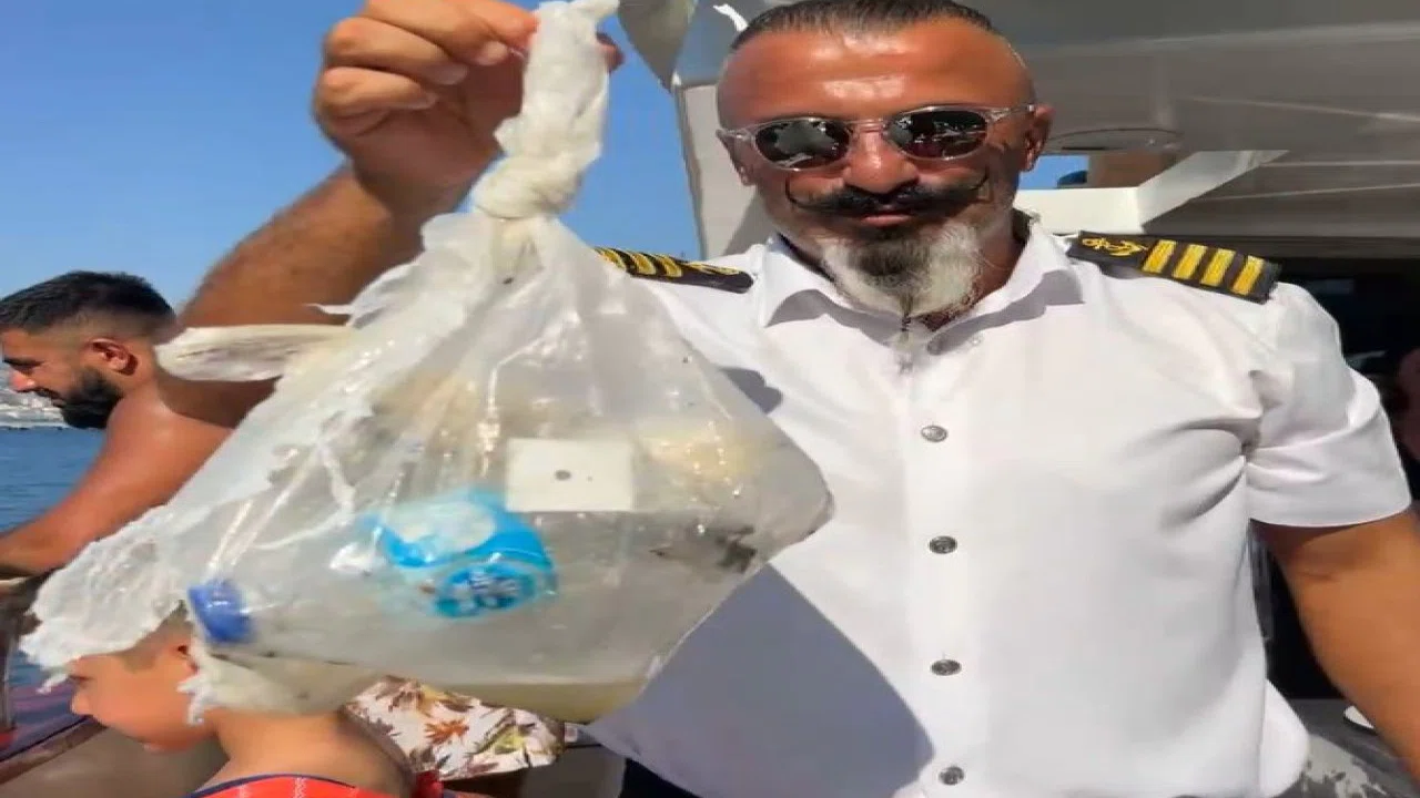 Günübirlik tur düzenleyen tekne kaptanı Turgay Meşe, hem çevre bilincini artırmayı hem de tatilin keyfini çıkarmayı amaçlamak için çöp toplama etkinliği düzenledi.