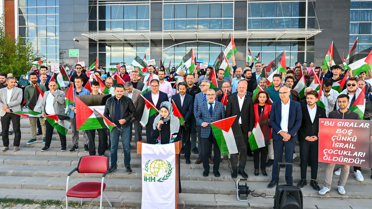 İnsan Hak ve Hürriyetleri Topluluğu'nun üniversite kütüphanesi önünde düzenlediği destek programına akademisyenler, öğrenciler, siyasi parti ile sivil toplum kuruluşlarının temsilcileri ellerinde Filistin bayrakları ve İsrail'i protesto eden pankartlarla katıldı.