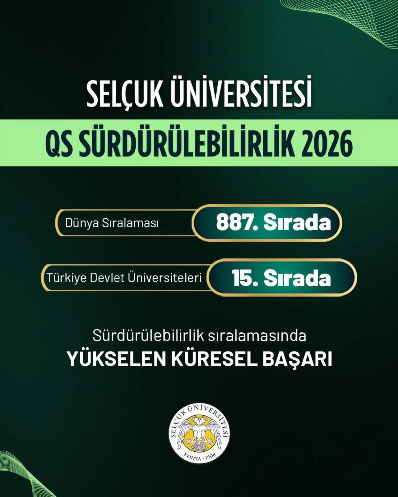 Üniversite, QS Dünya Üniversite Sıralaması: Sürdürülebilirlik 2026 sonuçlarında dünyadaki 2001 üniversite arasında 887., Türkiye’deki devlet üniversiteleri arasında ise 15. sırada yer aldı. Çevresel Etki, Sosyal Etki ve Yönetişim başlıklarının değerlendirildiği endekste Selçuk Üniversitesi, sürdürülebilir kalkınma hedefleriyle uyumlu araştırma ve eğitim yaklaşımını güçlendirdi.