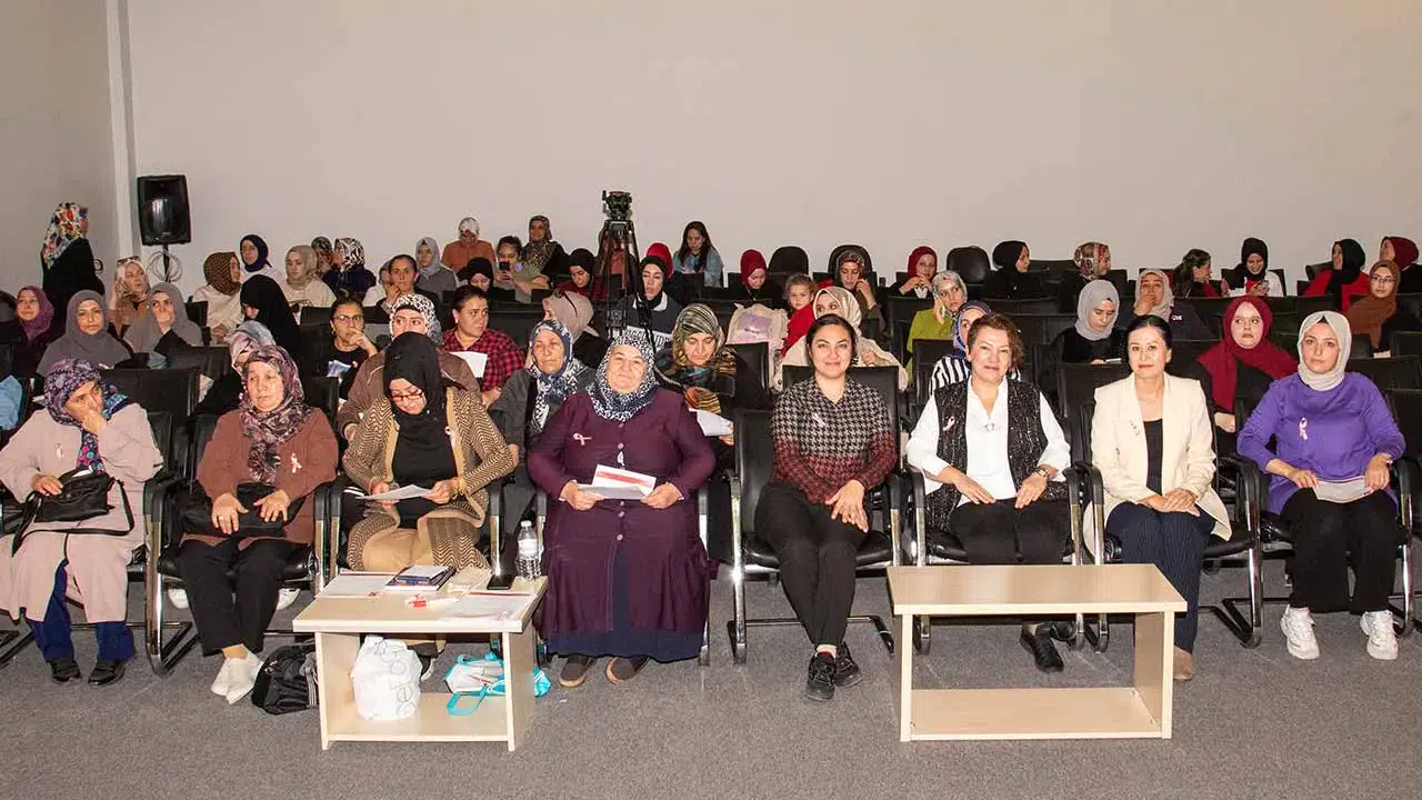 Konya Büyükşehir Belediyesi Yaygın Eğitim Şube Müdürlüğü ve Mümine Hatun Aile Sanat ve Eğitim Merkezi Hanımlar Lokali katkılarıyla hazırlanan seminerde katılımcılara meme kanseriyle mücadelede yapılacak yöntemler anlatıldı.