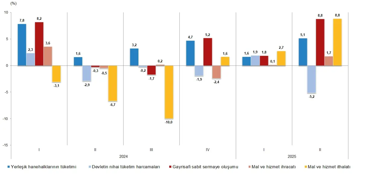 2025 yılının ikinci çeyreğinde hanehalkı nihai tüketim harcamaları, bir önceki yılın aynı çeyreğine göre zincirlenmiş hacim endeksi ile %5,1 oranında artış gösterdi. Tüketimdeki bu yükseliş, genel ekonomik büyüme ile paralel ilerlerken, devletin nihai tüketim harcamaları ise %5,2 oranında bir azalma ile karşılaştı. Bu durum, kamu sektörü harcamalarındaki azalmaların devlet bütçesi üzerindeki etkilerini yansıtıyor. Öte yandan, gayrisafi sabit sermaye oluşumu %8,8 oranında bir artış gösterdi. Bu artış, özellikle yatırım alanında bir canlılık olduğunu, ancak bunun sürdürülebilir bir büyüme olup olmadığı konusunda soru işaretleri bulunduğunu ifade ediyor. Ekonomideki bu hareketliliğin, tüketim ve yatırım dengesini nasıl etkileyeceği merak ediliyor.