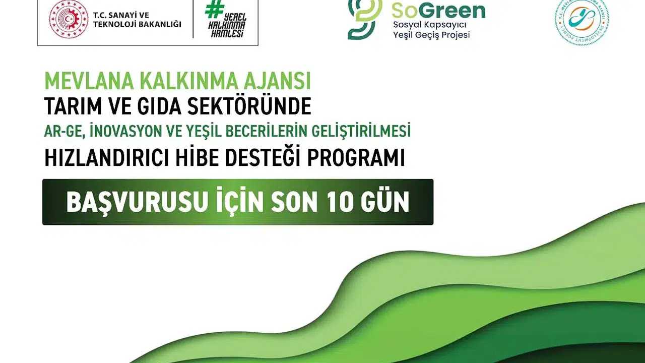 TR52 Konya-Karaman Bölgesi’nde çalışmalarını sürdüren Mevlana Kalkınma Ajansı tarafından 03 Temmuz 2025 tarihinde ilan edilen Tarım ve Gıda Sektöründe Ar-Ge, İnovasyon ve Yeşil Becerilerin Geliştirilmesi Hızlandırıcı Hibe Desteği Programı başvuruları 03 Eylül 2025 tarihinde sona eriyor.