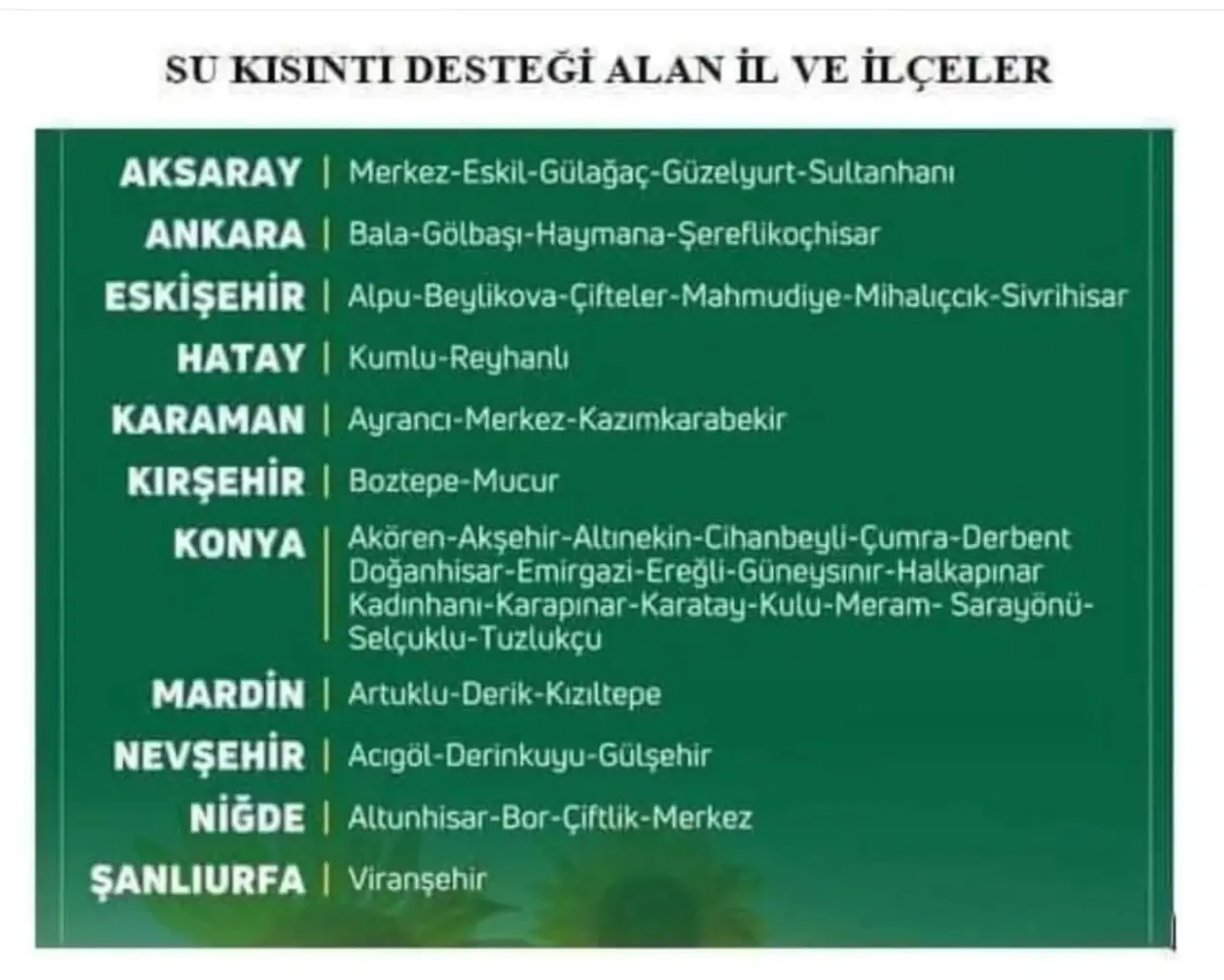 Soylu, 2024 yılı itibarıyla mısır, patates, pancar, havuç ve domates gibi yüksek su tüketen ürünlerin, araya mutlaka suyu az tüketen bitkiler (buğday, arpa, yağlık ayçiçeği, nohut, mercimek vb.) girmesi şartıyla aynı tarlada iki yılda bir ekilebileceğini belirtti.