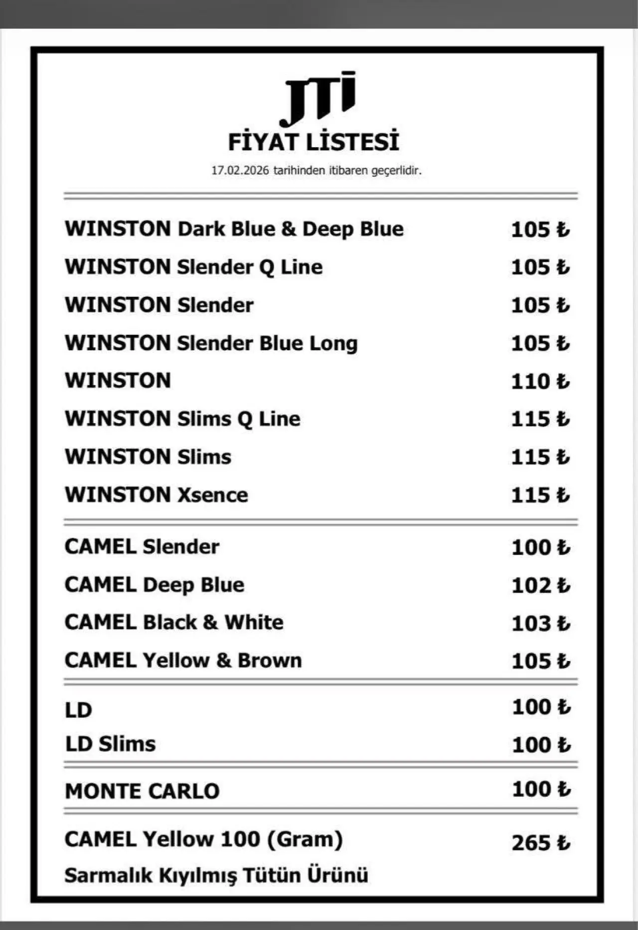 Sigara fiyatlarına zam yapıldı. JTI tarafından yayımlanan yeni fiyat listesine göre, artışlar 17 Şubat 2026 tarihinden itibaren geçerli olacak.
