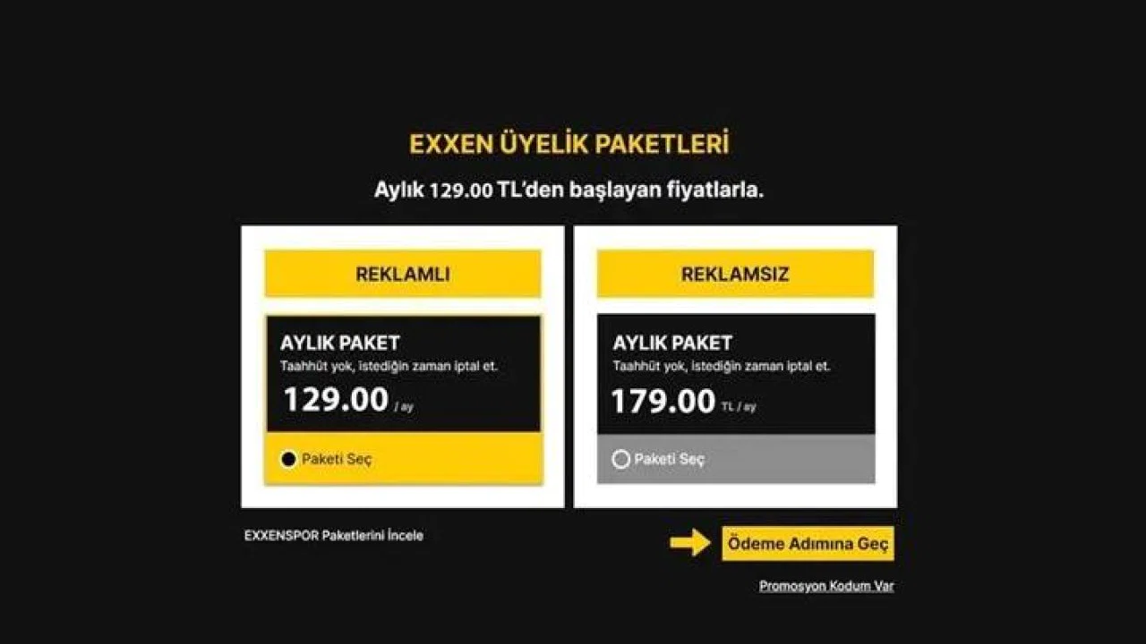 Yeni Fiyat Listesi:Reklamlı Exxen: Aylık: 99,90 TL’den 129,00 TL’ye çıktı Yıllık: Artık satışta değil Reklamsız Exxen: Aylık: 137,90 TL’den 179,00 TL’ye çıktı Yıllık: Artık satışta değil Reklamlı ExxenSpor: Aylık: 222,50 TL’den 289,00 TL’ye çıktı Sezonluk: Artık satışta değil Reklamsız ExxenSpor: Aylık: 260,50 TL’den 339,00 TL’ye çıktı Sezonluk: Artık satışta değilExxen’de 17 Şubat 2024 tarihinden itibaren geçerli olacak yeni fiyatlarla birlikte, Reklamlı Exxen 99,90 TL’den 129,00 TL’ye, Reklamsız Exxen ise 137,90 TL’den 179,00 TL’ye yükseldi. ExxenSpor paketlerinde de zam uygulandı.Exxen’de Fiyat Artışı Şoku! Reklamlı Paketlerde %30’a Varan Zam, Yıllık Paketler İptal Edildi.