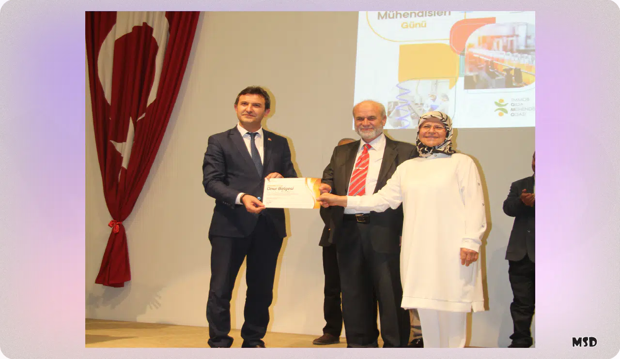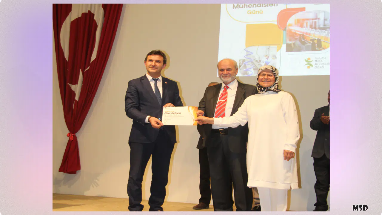 Gıda Mühendisleri Odası Konya Şubesi tarafından düzenlenen programda meslekte 25. yılını dolduran gıda mühendisi Ethem Öztoklu, belgesini eşi Fatma Öztoklu’nun elinden aldı.