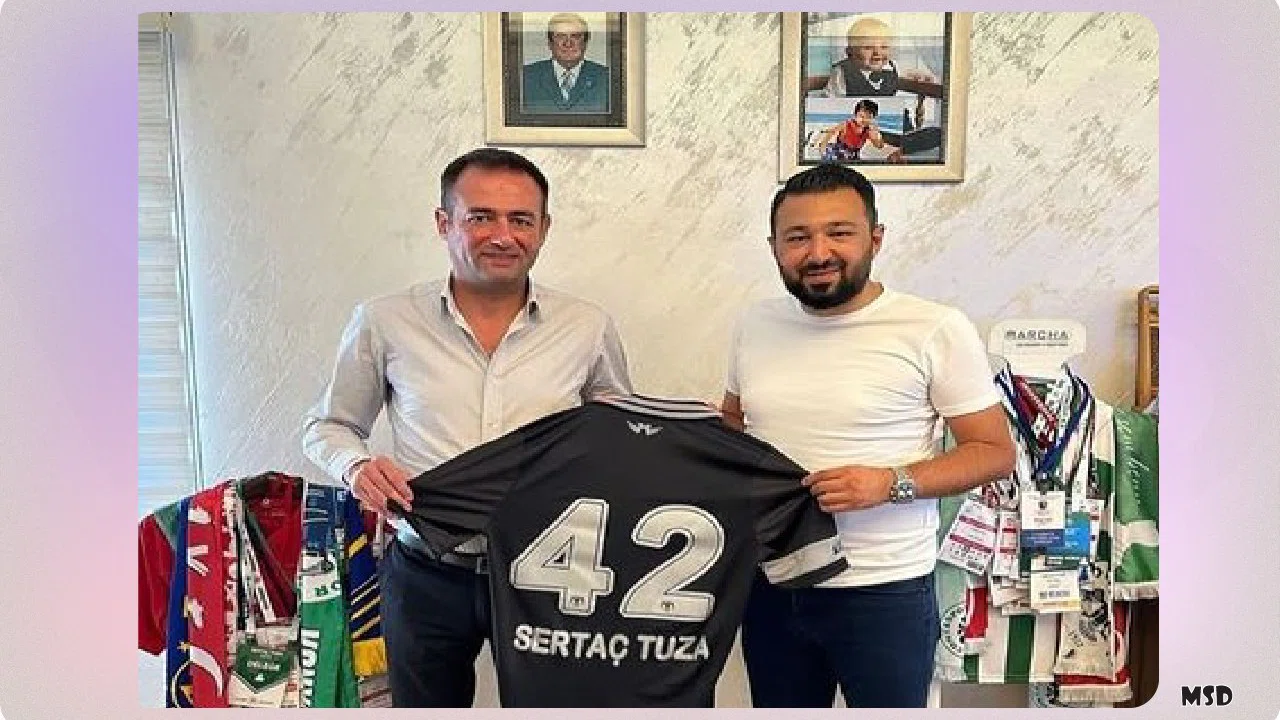 Konya’nın genç ve başarılı iş insanı Sertaç Tuza’ya 1922 Konyaspor’a desteklerinden dolayı Başkan Yardımcısı Fikret Serkan Yapalı tarafından isminin yazılı olduğu forma hediye edildi.