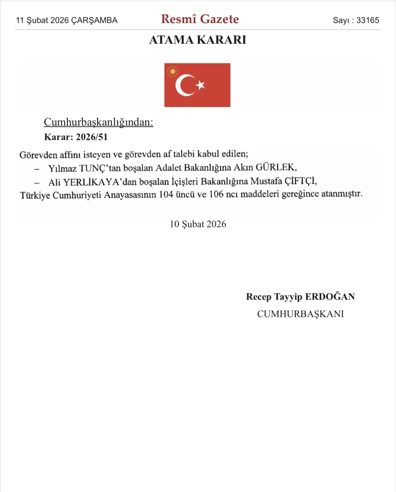 Söz konusu atamaların, Türkiye Cumhuriyeti Anayasası’nın 104’üncü ve 106’ncı maddeleri gereğince yapıldığı bildirildi. Atama kararı 10 Şubat 2026 tarihini taşıyor.