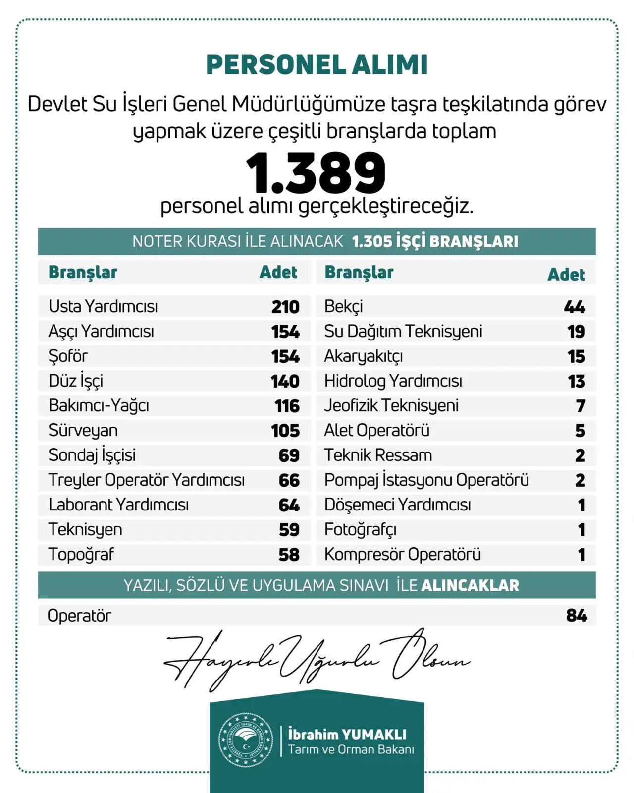 Tarım ve Orman Bakanı İbrahim Yumaklı, Devlet Su İşleri (DSİ) Genel Müdürlüğü’nün taşra teşkilatında görevlendirilmek üzere 1.389 personel alımı yapacağını açıkladı.
