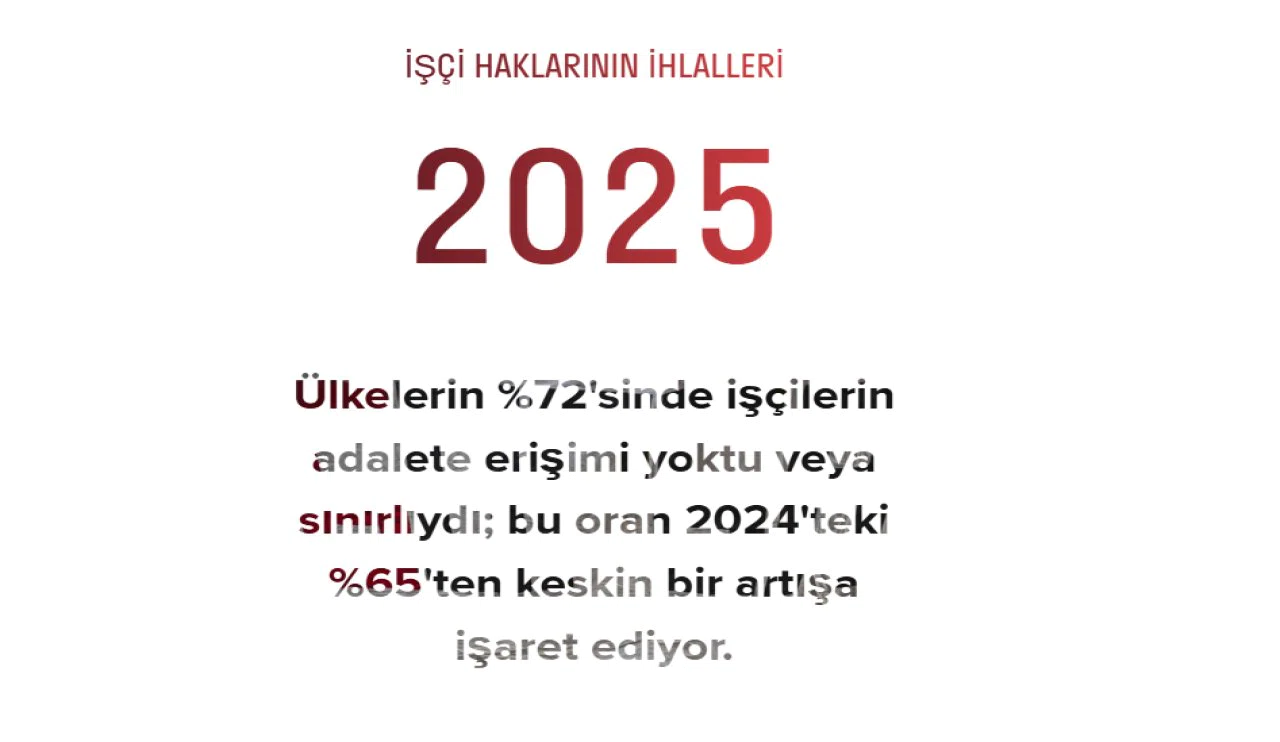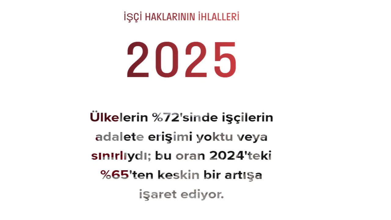 Raporda, dünya genelinde işçilerin grev hakkı, toplu pazarlık hakkı ve adalete erişimi gibi temel haklarında ciddi kısıtlamalar olduğu vurgulandı. İncelenen ülkelerin yüzde 87’si grev hakkını, yüzde 80’i toplu pazarlık hakkını ihlal ederken, yüzde 72’sinde işçilerin adalete erişimi engellendi. Bu rakamlar, işçi hakları alanında küresel çapta rekor kötüleşmeye işaret ediyor.