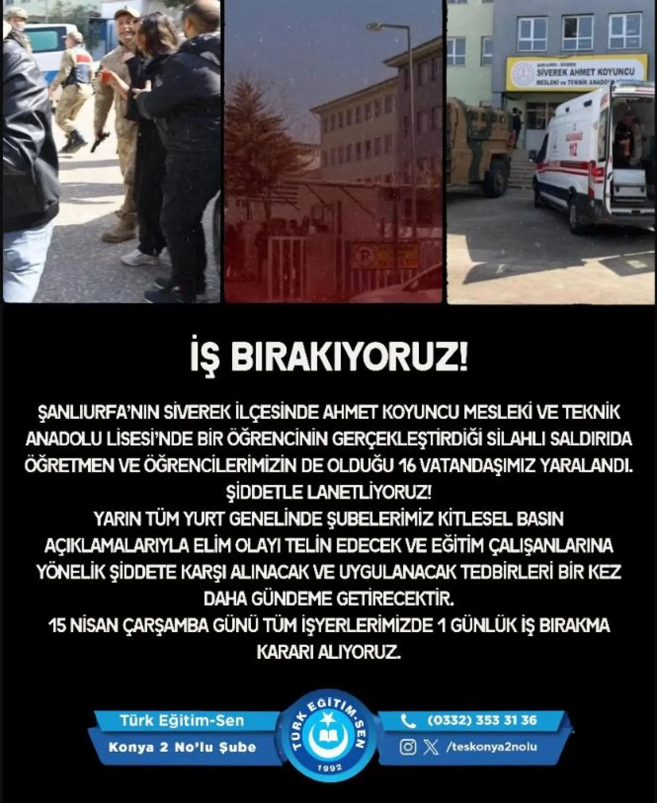 Şanlıurfa’nın Siverek ilçesinde bir lisede meydana gelen silahlı saldırı, eğitim camiasında büyük yankı uyandırdı. Olayın ardından eğitim sendikaları peş peşe açıklamalar yaparken, Türk Eğitim-Sen 1 günlük iş bırakma kararı aldığını duyurdu.