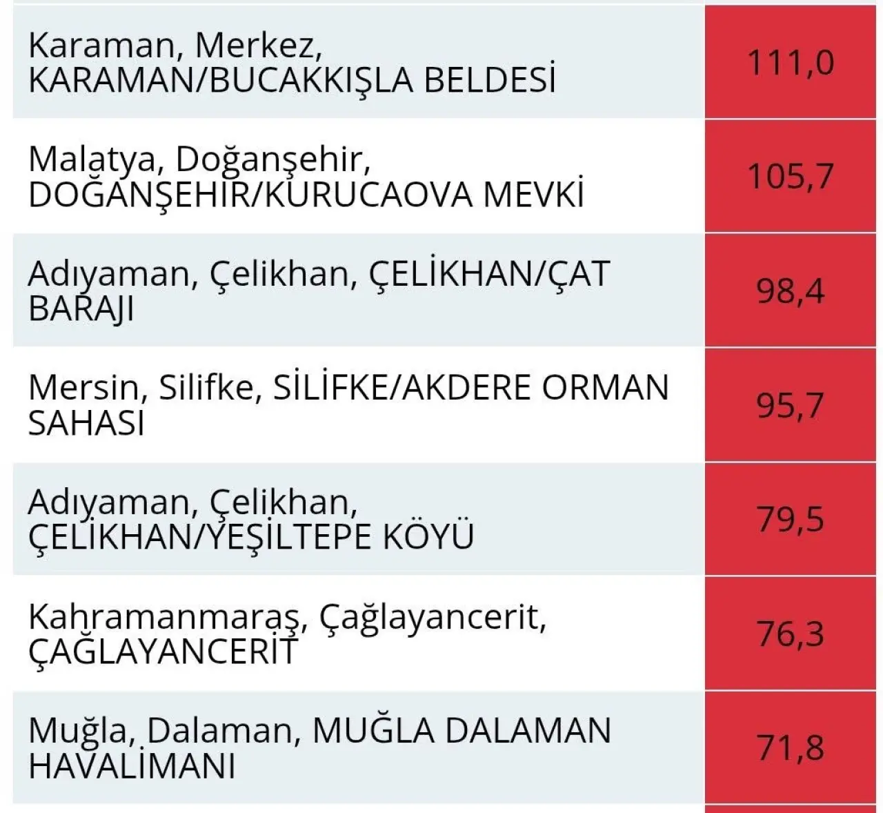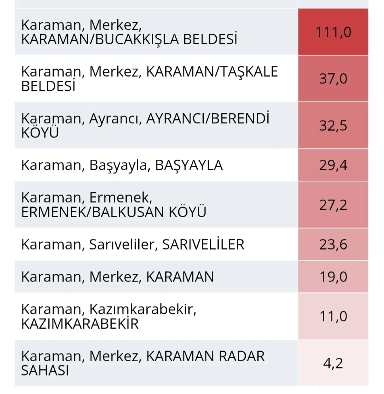 6 Aralık’ta Türkiye genelinde en yüksek yağış Karaman’da kaydedildi. Meteoroloji Genel Müdürlüğü (MGM) verilerine göre Karaman Bucakkışla istasyonu tam 111 mm (kg/m²) yağış aldı.