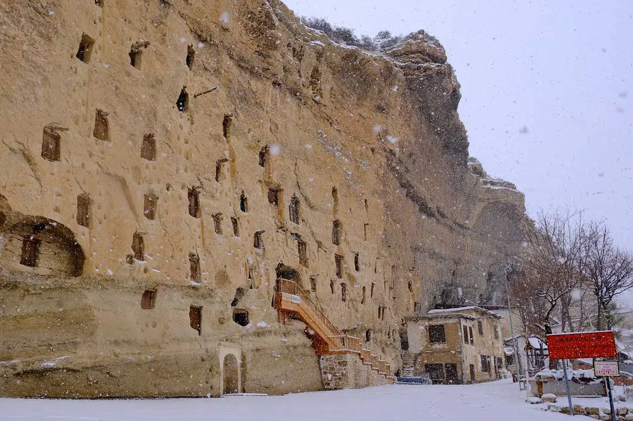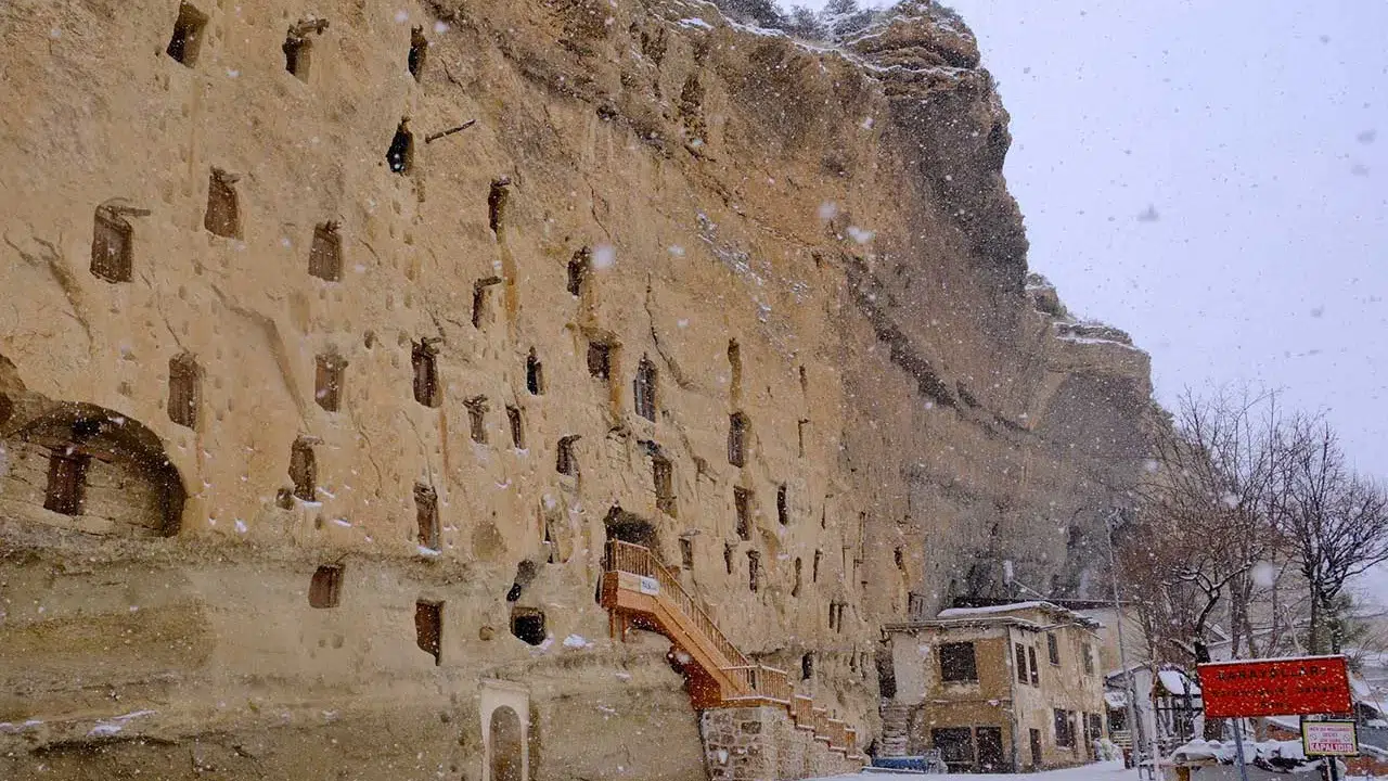 Manazan Mağaraları çevresinde oluşan kar manzarası, bölgeye gelen ziyaretçilerin ve fotoğraf tutkunlarının ilgisini çekti. Karla kaplanan tarihi yapılar, geçmiş ile doğanın eşsiz uyumunu bir kez daha gözler önüne serdi.