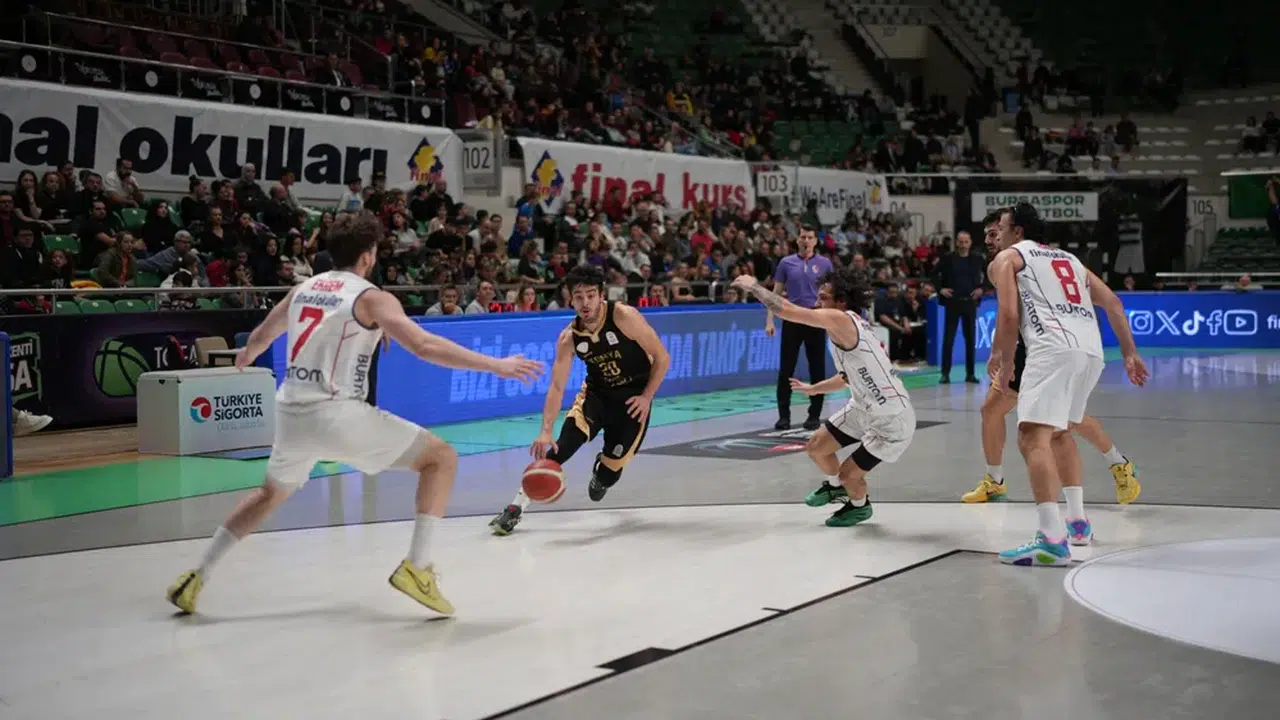 Maça üçlük yağmuru ile başlayan sarı-siyahlı ekip, ilk çeyreği 27-22 önde geçti. İkinci çeyrekte 14-0’lık seri yakalayan Bursa ekibi, skorda 7 sayı ile öne geçti. Ancak Enes Bayraktar önderliğinde toparlanan Konya BBSK oyunda dengeyi sağladı. İlk yarı 43-43’lük eşitlikle sona erdi.