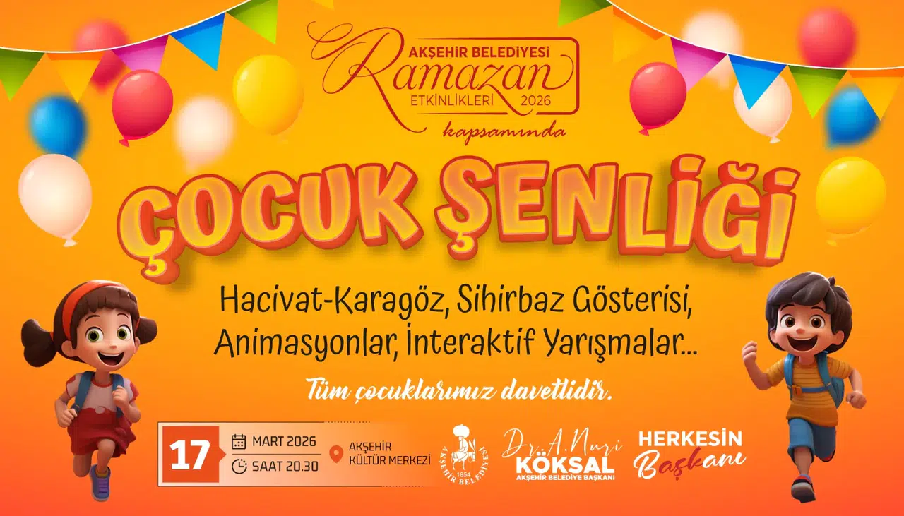 Akşehir Belediye Başkanı Dr. A. Nuri Köksal, etkinlikle ilgili olarak, “Ramazan ayı boyunca gerçekleştirdiğimiz kültür ve sanat etkinliklerimizi, finalde çocuklarımız için özel bir programla taçlandırıyoruz. Bayram demek, öncelikle çocuklarımızı mutlu etmek demektir. Biz de bayram arifesinde minik hemşehrilerimizin keyifle vakit geçireceği bir akşam yaşatmak istiyoruz. Tüm çocuklarımızı ve ailelerini Çocuk Şenliğimize davet ediyoruz” dedi.