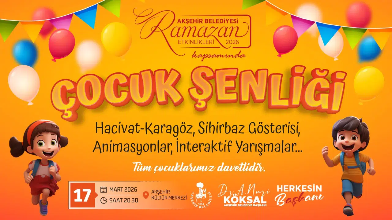 Akşehir Belediyesi, Ramazan ayı boyunca düzenlediği kültür ve sanat etkinliklerini çocuklara özel hazırlanan programla sona erdirecek. Ramazan Etkinlikleri kapsamında gerçekleştirilecek Çocuk Şenliği, 17 Mart Salı günü saat 20.30’da Akşehir Kültür Merkezi’nde düzenlenecek.