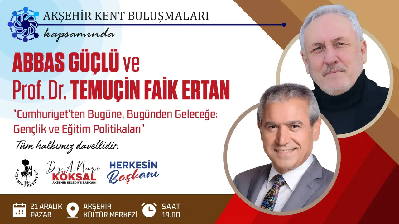 Akşehir Belediyesi’nin düzenlediği Akşehir Kent Buluşmaları programında gazeteci Abbas Güçlü ile Prof. Dr. Temuçin Faik Ertan, “Cumhuriyet’ten Bugüne, Bugünden Geleceğe: Gençlik ve Eğitim Politikaları” konulu söyleşide Akşehirlilerle bir araya gelecek. Etkinlik, 21 Aralık Pazar günü saat 19.00’da Akşehir Kültür Merkezi’nde düzenlenecek.