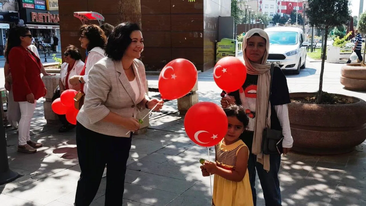 30 Ağustos Zafer Bayramı nedeniyle CHP Meram İlçe Kadın Kolları, bayramın ruhunu yaşatmak için çocuklara bayrak, balon vererek sevindirirken, çeşitli ikramlarda bulundu.
