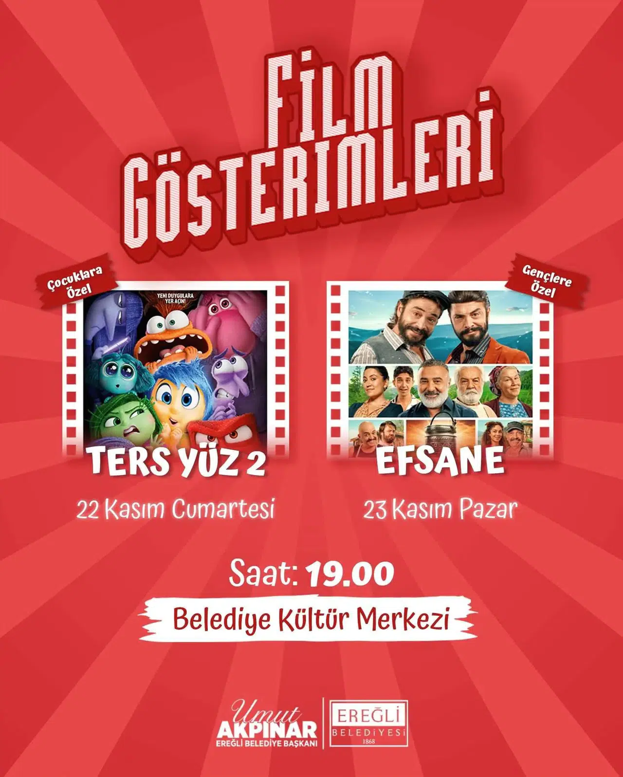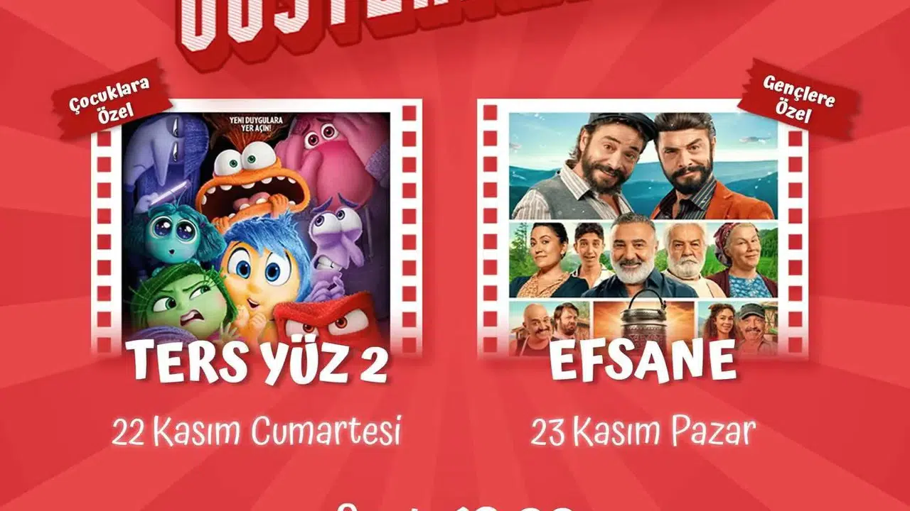 Ereğli Belediye Başkanı Umut Akpınar, kültür ve sanat etkinliklerine ara vermeden devam ettiklerini belirterek, “Dev ekranda film gösterimleri kapsamında birbirinden güzel yapımları halkımızla buluşturmaya devam ediyoruz. ‘Ters Yüz 2’ adlı animasyon ve ‘Efsane’ adlı komedi filminin keyfini hep birlikte yaşamaya tüm halkımız davetlidir.” ifadelerini kullandı. Program kapsamında; Ters Yüz 2 (Animasyon Filmi) 22 Kasım 2025 Cumartesi günü 19.00’da Ereğli Belediye Kültür Merkezinde ise Efsane (Komedi Filmi) 23 Kasım 2025 Pazar tarihinde 19.00 Belediye Kültür Merkezinde sinema severlerle buluşacak.