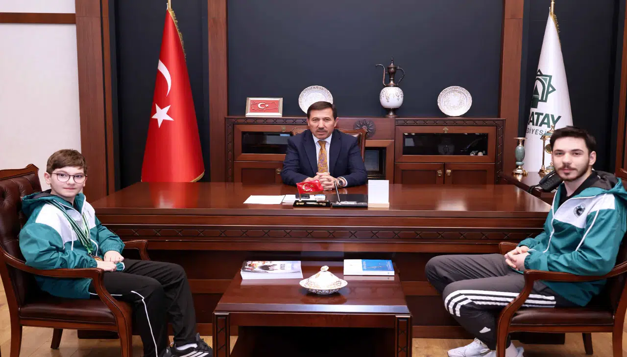 Başarı sonrası antrenörü Muhammed Huzeyfe Kılınç ile birlikte Başkan Hasan Kılca’yı makamında ziyaret eden Tahir Efe Şahin, mutluluğunu paylaştı.