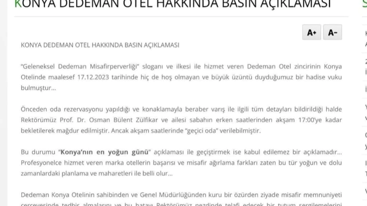 "'Geleneksel Dedeman Misafirperverliği' sloganı ve ilkesi ile hizmet veren Dedeman Otel zincirinin Konya Otelinde maalesef 17.12.2023 tarihinde hiç de hoş olmayan ve büyük üzüntü duyduğumuz bir hadise vuku bulmuştur… Önceden oda rezervasyonu yapıldığı ve konaklamayla beraber varış ile ilgili tüm detayları bildirildiği halde Rektörümüz Prof. Dr. Osman Bülent Zülfikar ve ailesi sabahın erken saatlerinden akşam 17:00’ye kadar bekletilerek mağdur edilmiştir. Ancak akşam saatlerinde 'geçici oda' verilebilmiştir.