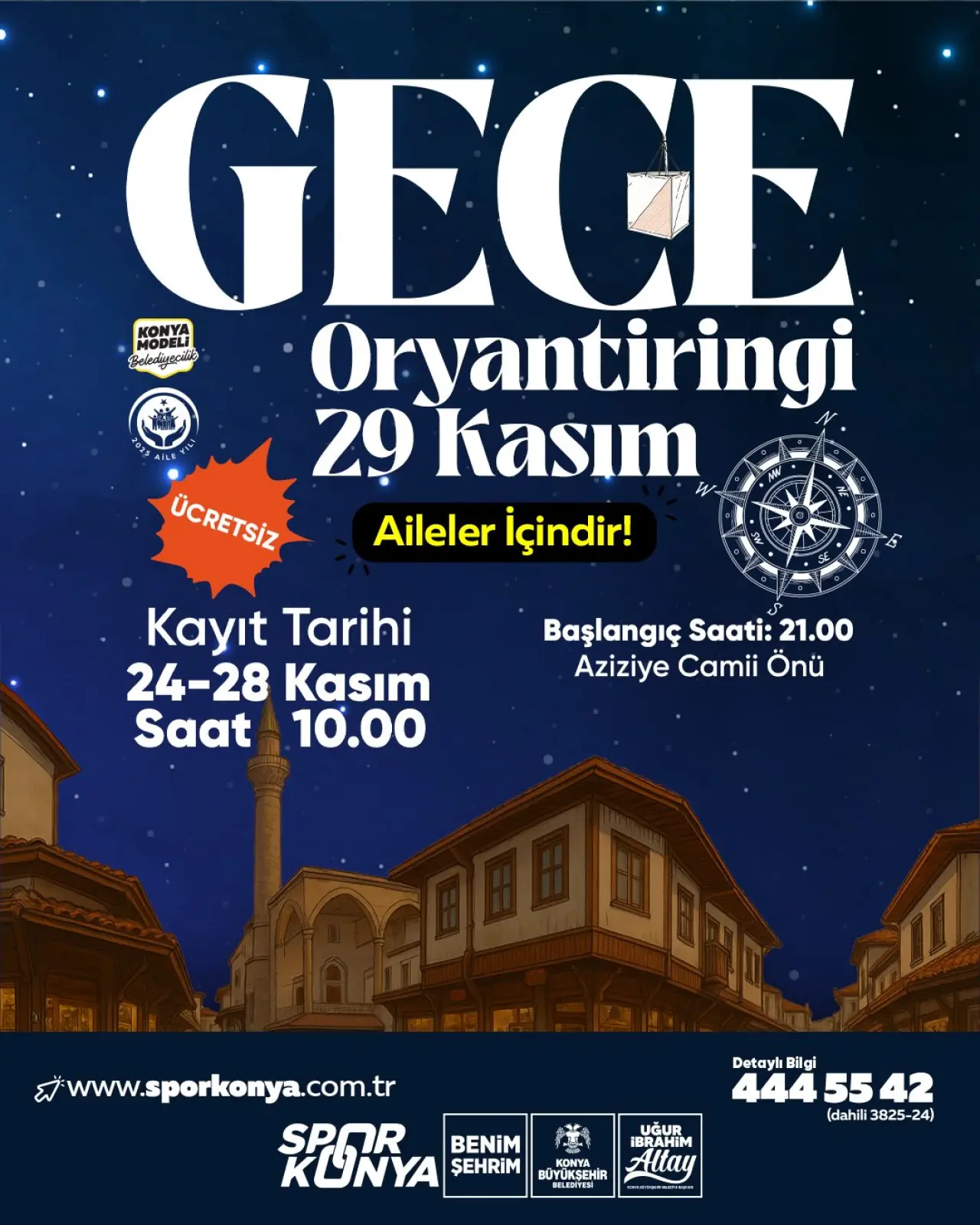 Konya Büyükşehir Belediyesi, ailelerin birlikte katılabileceği özel bir gece oryantiring etkinliği düzenliyor. 29 Kasım’da Aziziye Camii önünden başlayacak etkinlik, 4 farklı kategoriyle her yaştan katılımcıya hitap edecek.