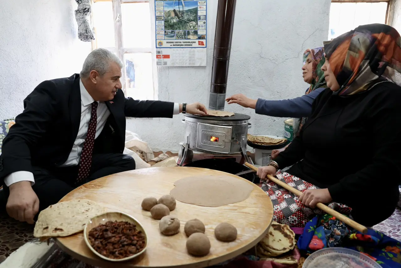 Vali Akın paylaşımında, “Hadim Gezlevi Mahallemizde, Torosların sabrından sofraya uzanan kadim bir geleneğe şahit olduk. Dağların bağrından toplanan Boz armudun kurutulup una dönüşmesiyle yapılan ‘kükürt ekmeği’ adeta Toroslardan yükselen bir umut tohumu gibi. Doğayla uyumlu bu üretim, toprağın bereketini geleceğe taşıyan sürdürülebilir yaşamın da önemli bir tezahürüdür. Kültürümüzün lezzet hafızasını yaşatan hemşehrilerimize teşekkür ediyorum.” ifadelerine yer verdi.