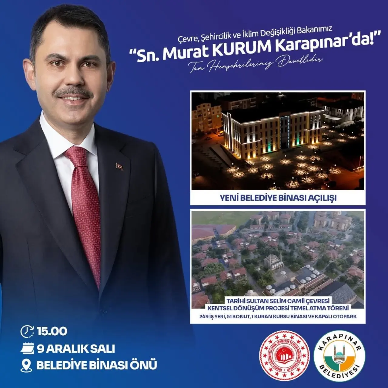 Karapınar, önemli bir güne hazırlanıyor. Çevre, Şehircilik ve İklim Değişikliği Bakanı Murat Kurum, ilçede düzenlenecek iki büyük programa katılacak. Karapınar Belediye Başkanı İbrahim Önal, tüm ilçe halkını bu büyük buluşmaya davet etti.