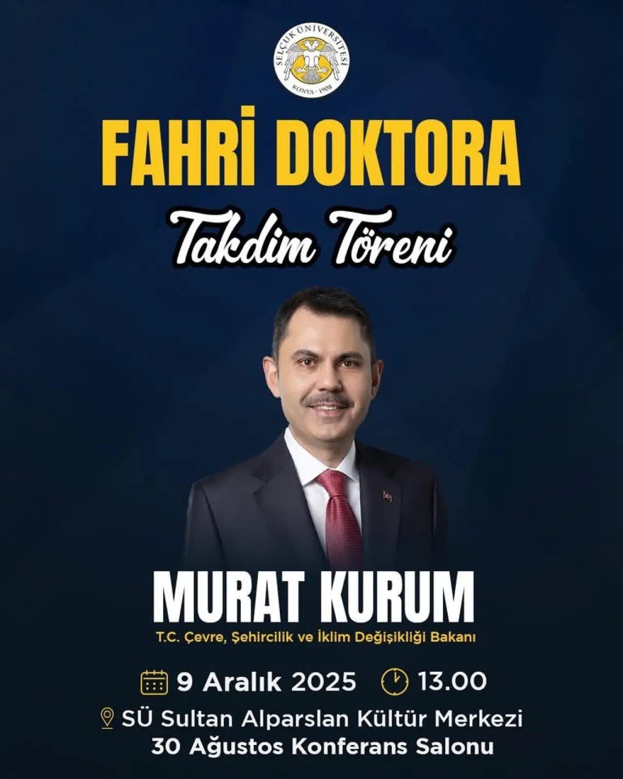 Selçuk Üniversitesi, Çevre, Şehircilik ve İklim Değişikliği Bakanı Murat Kuruma “Sürdürülebilir Şehirleşme ve Kentsel Dönüşüm” alanında Fahri Doktora unvanı verileceğini duyurdu.