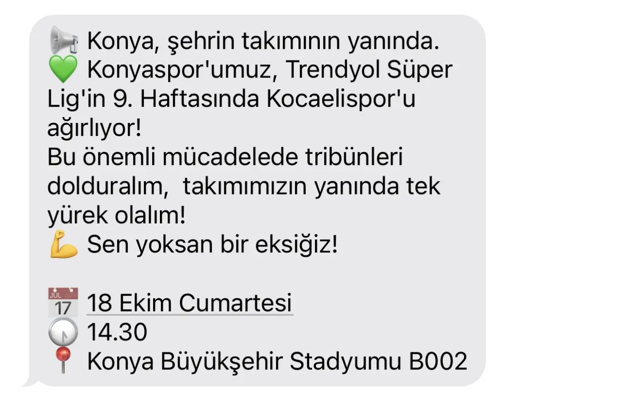 Konya Büyükşehir Belediyesi, Trendyol Süper Lig’in 9. haftasında oynanacak Konyaspor–Kocaelispor karşılaşması öncesinde taraftarlara çağrıda bulundu.
