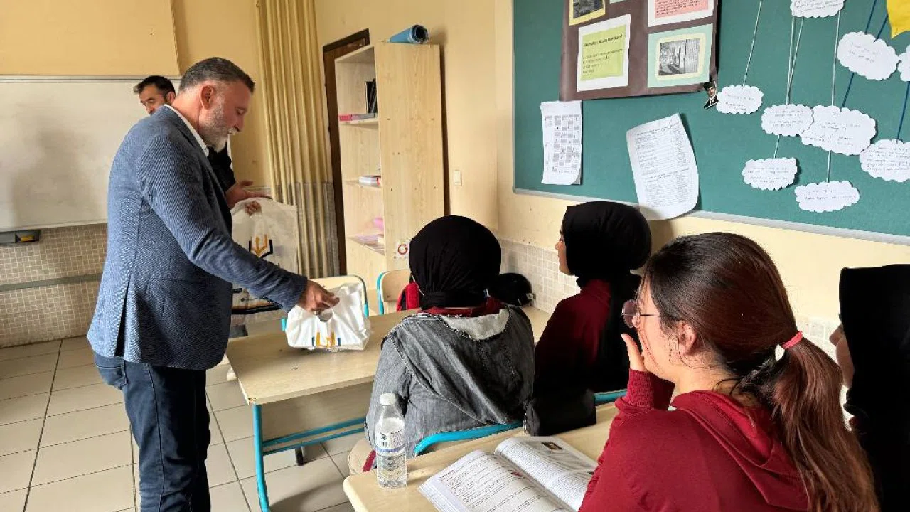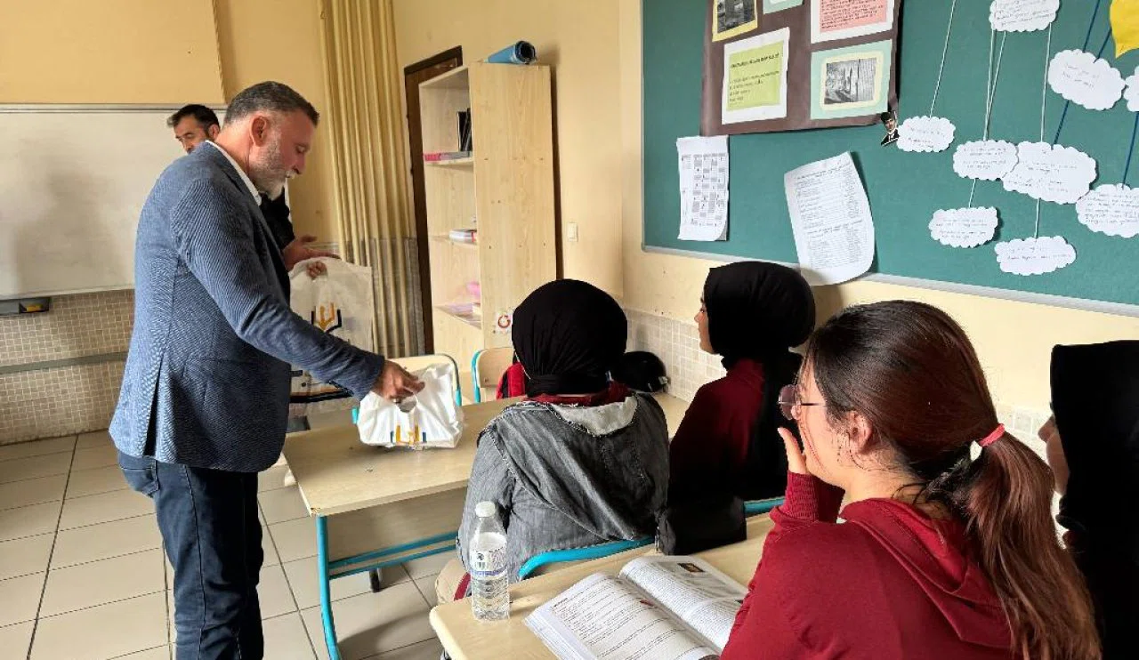 Öğrencilerle bir süre sohbet eden Derbent Belediye Başkanı Ayten, üniversite sınavına hazırlanan gençlere üniversite hazırlık seti hediye etti.