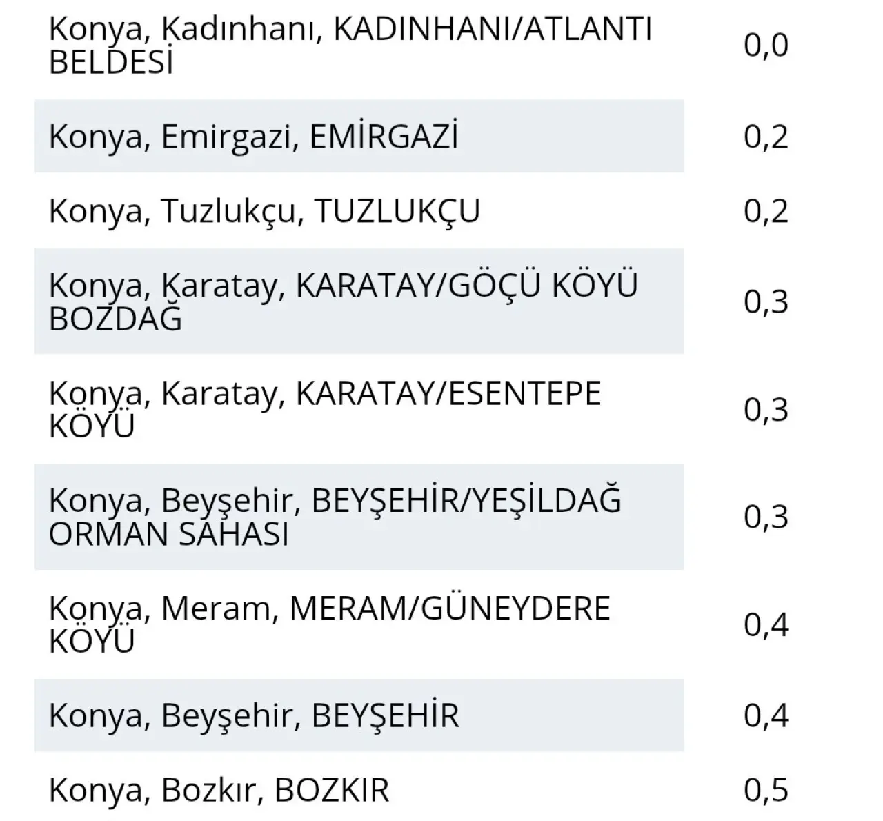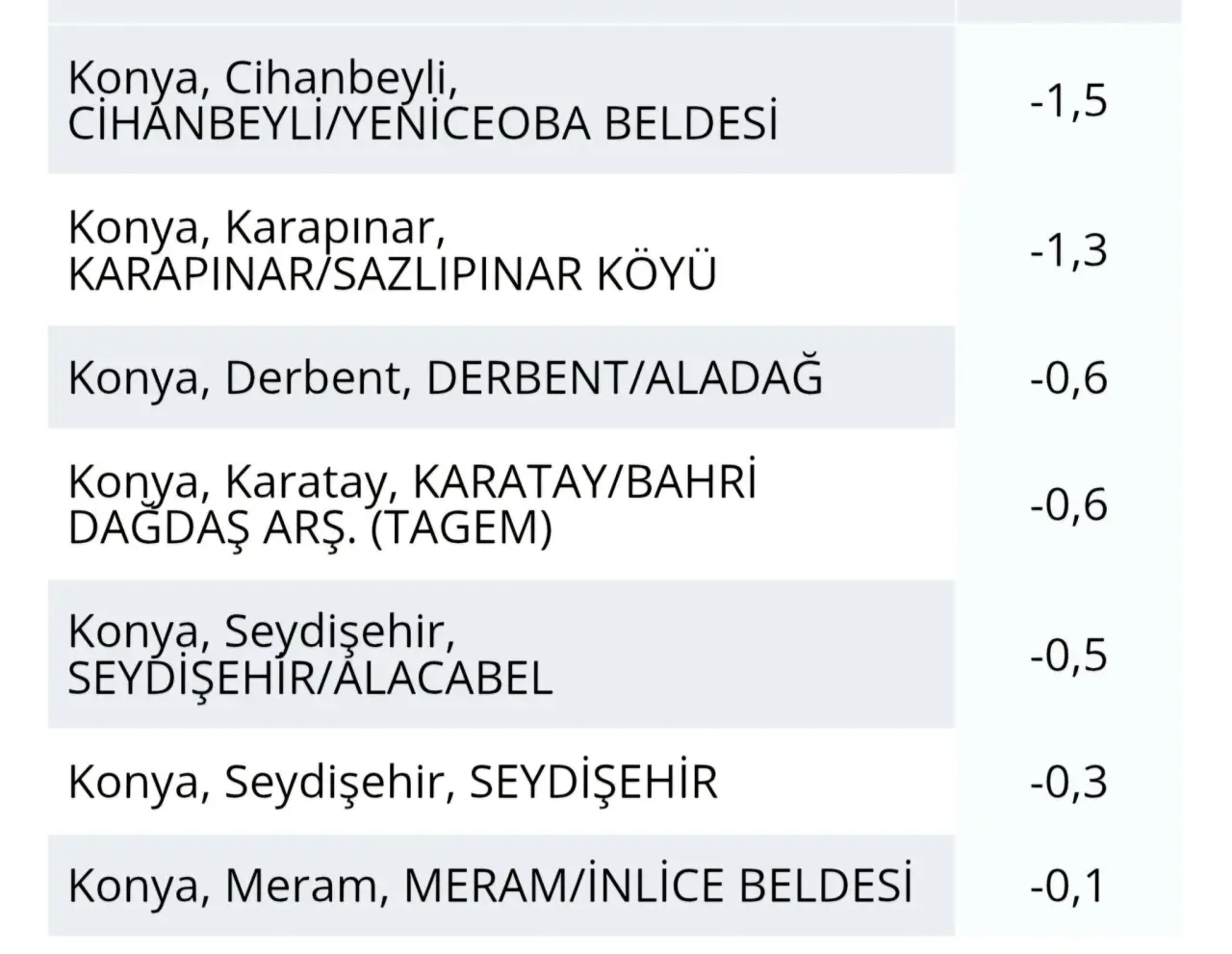 Kadınhanı Atlanti, Emirgazi, Tuzlukçu, Karatay Göçü Köyü, Beyşehir Yeşildağ ve Meram Güneydere gibi yerleşimlerde 0 ila 0,4°C değerleri görüldü.