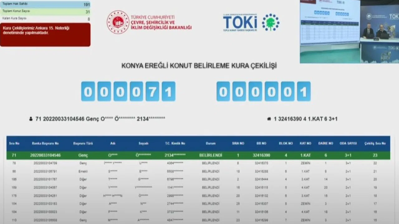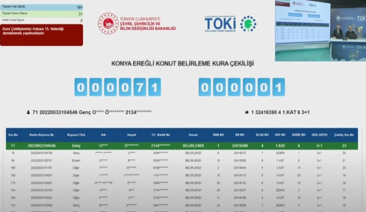 Çekiliş sonuçlarının noter onayı sonrası TOKİ’nin resmi internet sitesinde yayımlanacağı bildirildi. Hak sahipleri, kura sonuçlarını TOKİ’nin duyurular bölümünden öğrenebilecek.