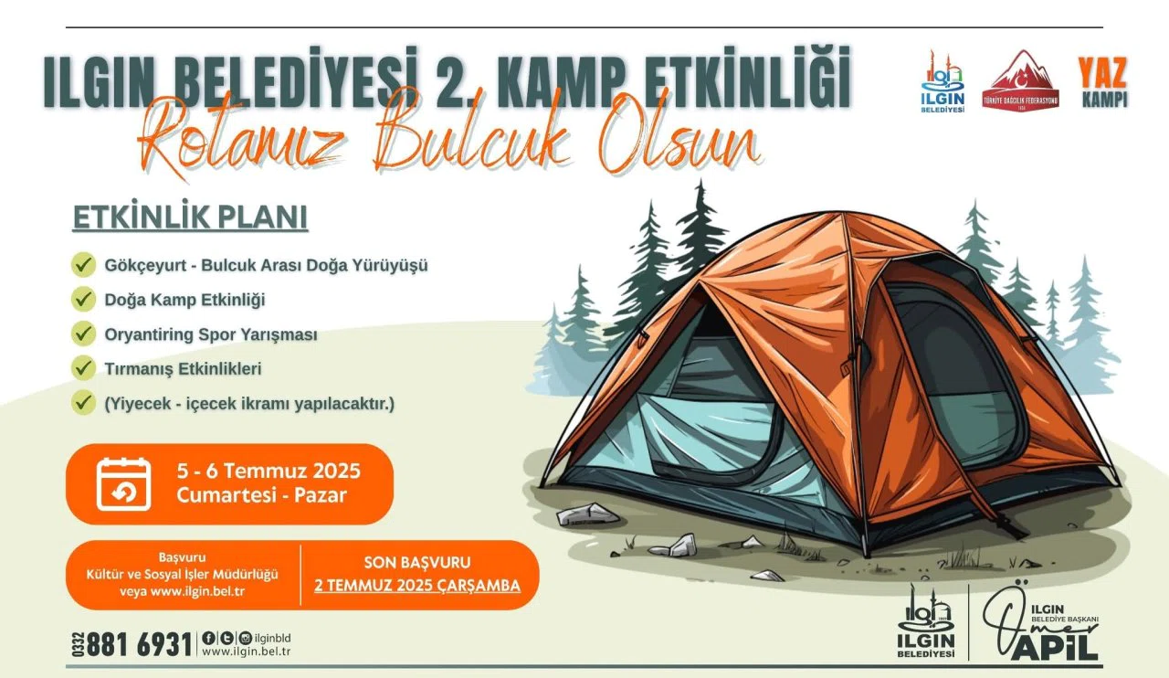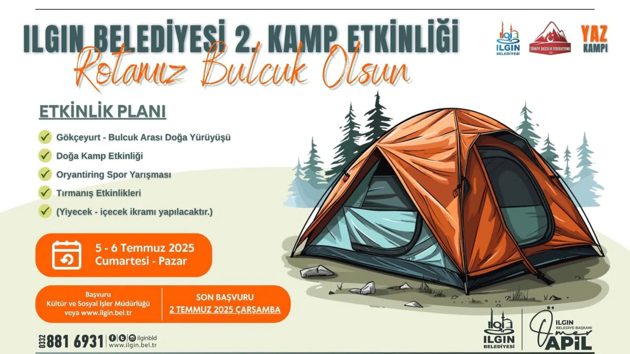 Konya Ilgın Belediyesi, doğa ve kamp tutkunlarına özel bir etkinlik düzenliyor. Belediye Başkanı Ömer Apil, sosyal medya hesabından yaptığı duyuruda, “Rotamız Bulcuk Olsun” sloganıyla gerçekleştirilecek doğa yürüyüşü ve kamp etkinliği için tüm vatandaşları davet etti.
