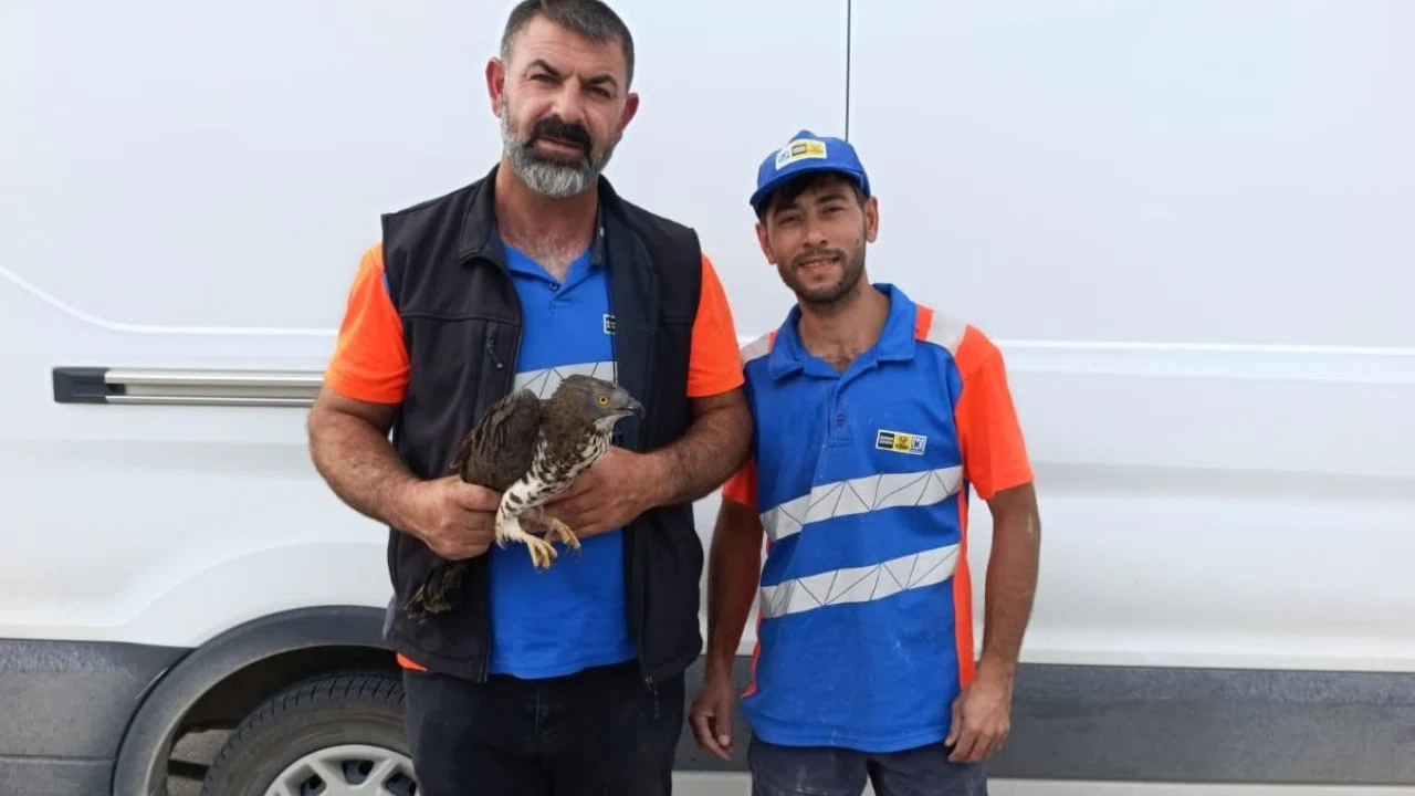 İlçeye bağlı Hotamış Mahallesinde çalışma yapan KOSKİ çalışanları Tarık Akyıldız ve Bekir Dağlıoğlu, boş arazide yaralı şahin olduğunu gördü.