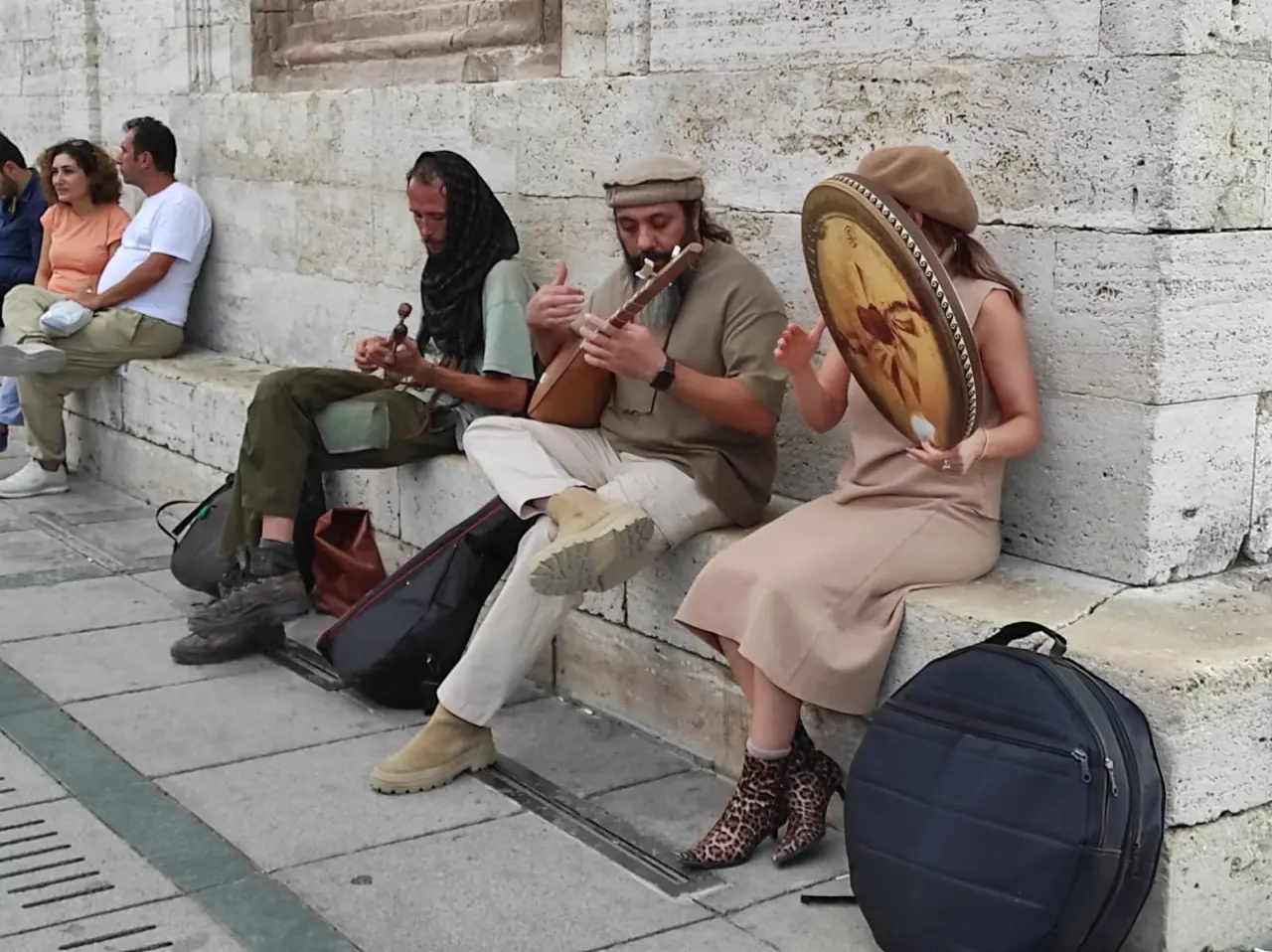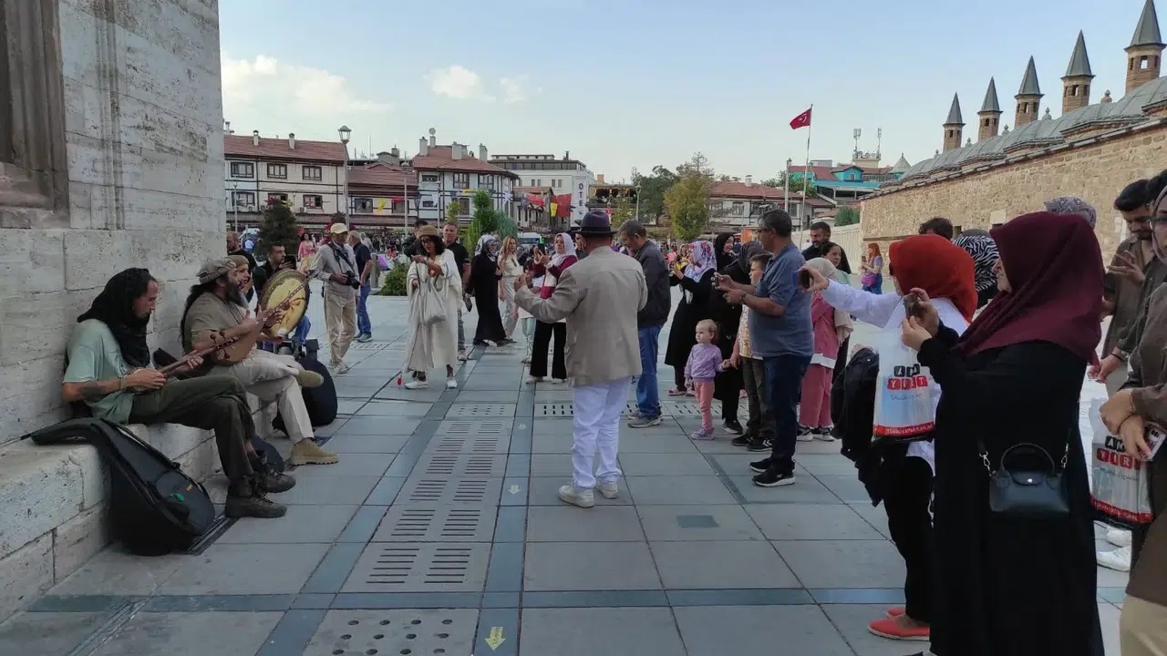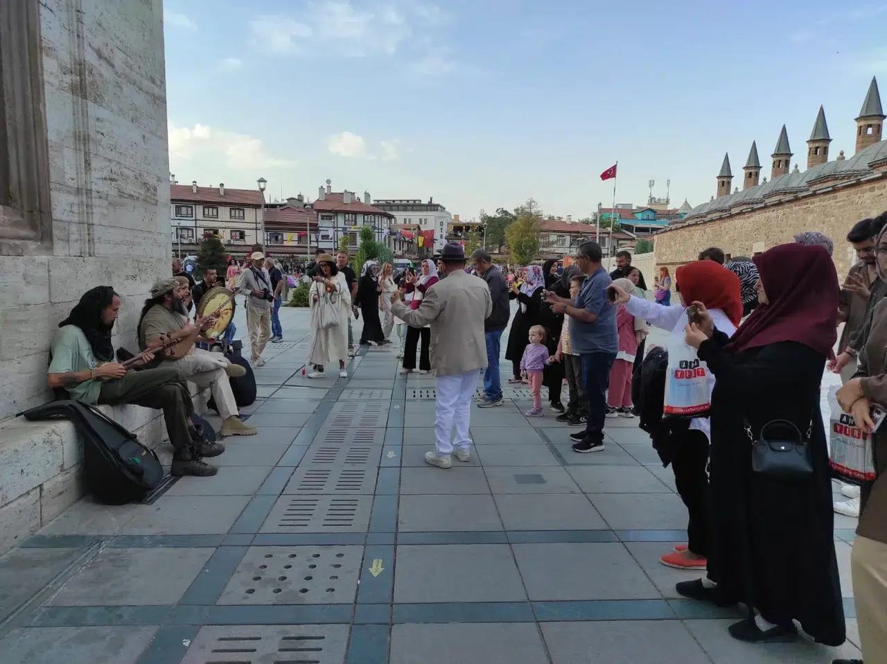 Mevlana Meydanı’ndaki tarihi Sultan Selim Camii yanında canlı performans sergileyen gruplar, yerli ve yabancı turistlerden büyük ilgi görüyor.