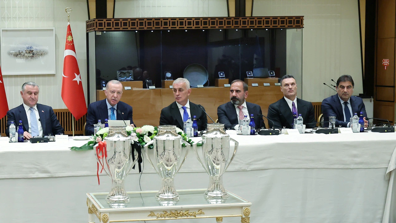 Kabulde bir konuşma yapan Cumhurbaşkanı Erdoğan, "Sizlerle bir araya gelmekten büyük bir memnuniyet duyuyorum. Öncelikle sizleri 2024-25 sezonunda elde ettiğiniz başarıdan dolayı canıgönülden tebrik ediyorum. Oldukça çekişmeli geçen bir spor takvimini sorunsuz, sıkıntısız bir şekilde geride bıraktık. İnsanımız ve taraftarlarımızı derinden yaralayacak, futbolun ruhuna ters düşecek olaylarla karşılaşmadık. Gelecek sezonda da bu atmosferi iyileştirerek devam ettirmemiz gerekiyor.