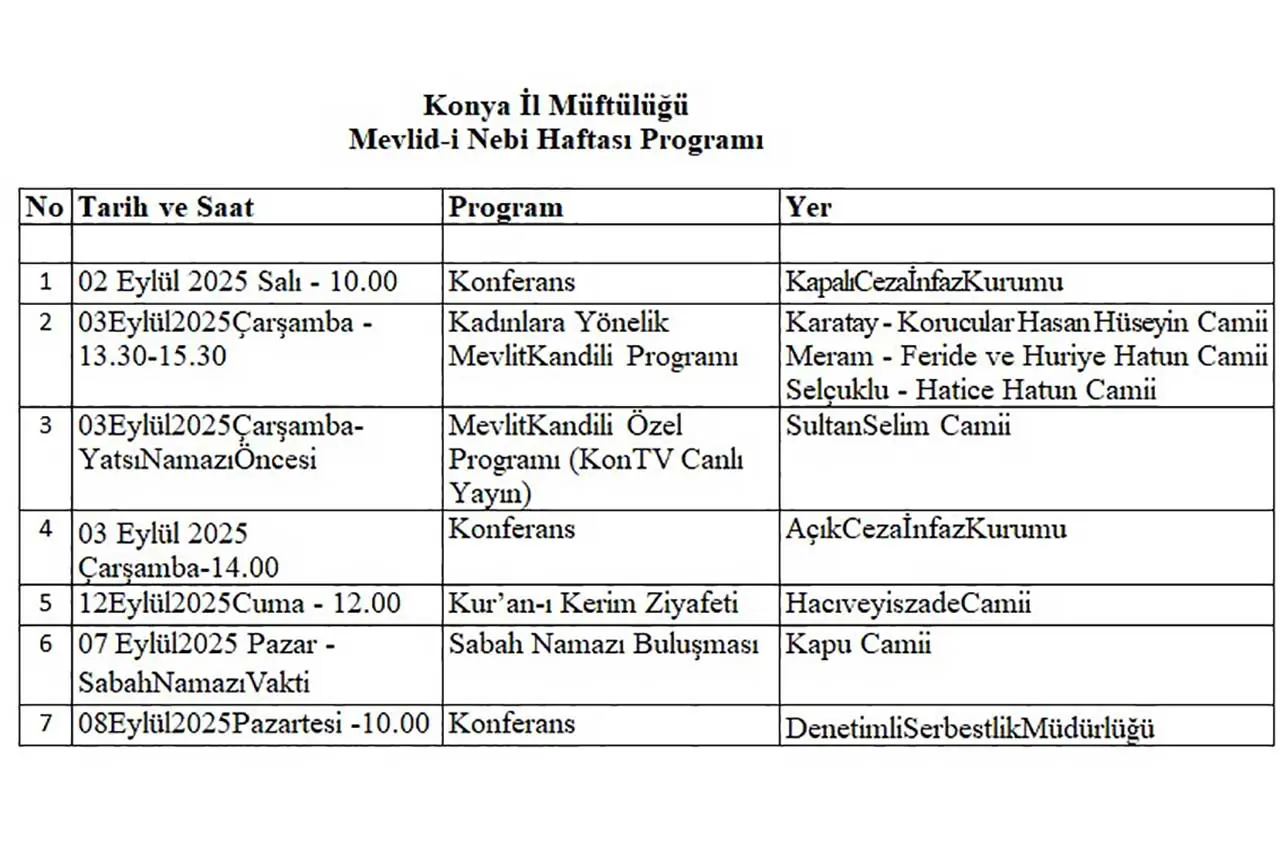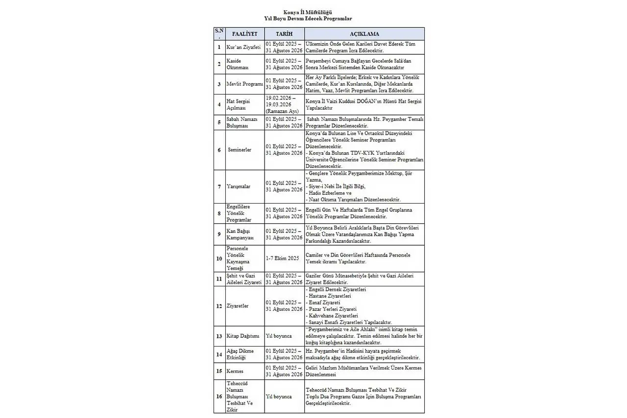 Konya'da icra edileceği açıklanan programlar şu şekilde: