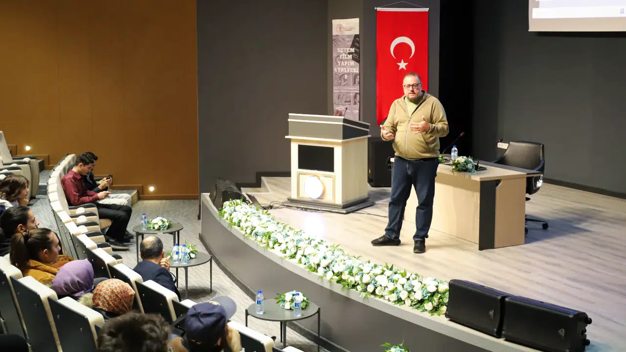 Etkinlikte SETEM temsilcisi senarist ve yapımcı Orhan Koçak, film yapım süreçleri ve sektörel deneyimlerini öğrencilerle paylaştı. Koçak, Türkiye’nin önemli bir coğrafyada yer aldığını vurgulayarak öğrencilere, bu toprakların hikâyelerini dizi, film ve belgesel gibi yapımlarla dünyaya aktarmaları gerektiğini söyledi. Koçak, “Dünya sizlerden çok nitelikli eserler bekliyor. Kendimize güveneceğiz, kendimizi yetiştireceğiz ve dünya sinemacısı olarak Türkiye’yi önemli platformlarda temsil edeceğiz” ifadelerini kullandı.