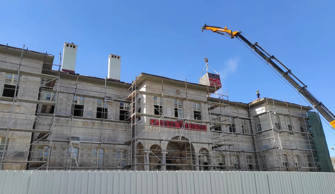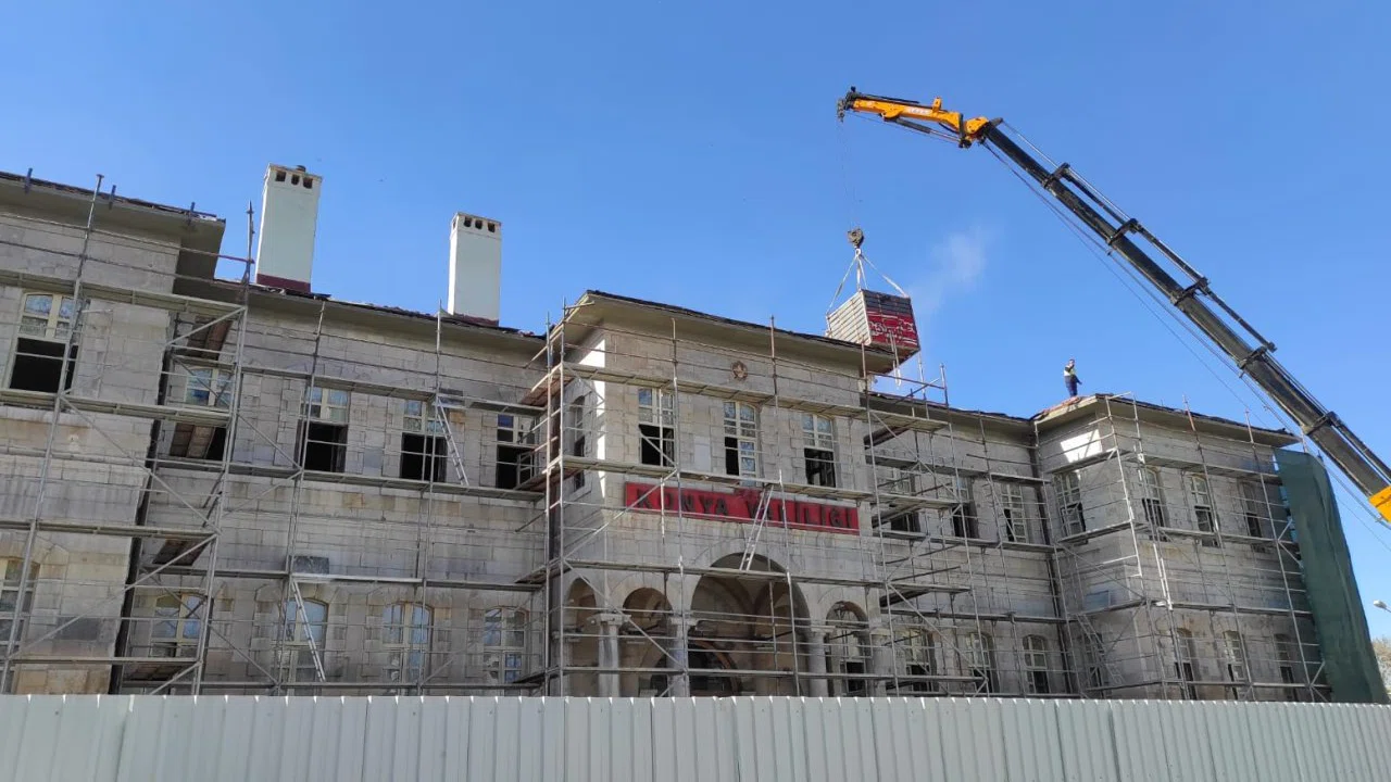 Konya'nın Selçuklu dönemine ait dış kale duvar taşları üzerine inşa edilen tarihi Konya Valiliği binasında restorasyon çalışmaları hızla devam ediyor.