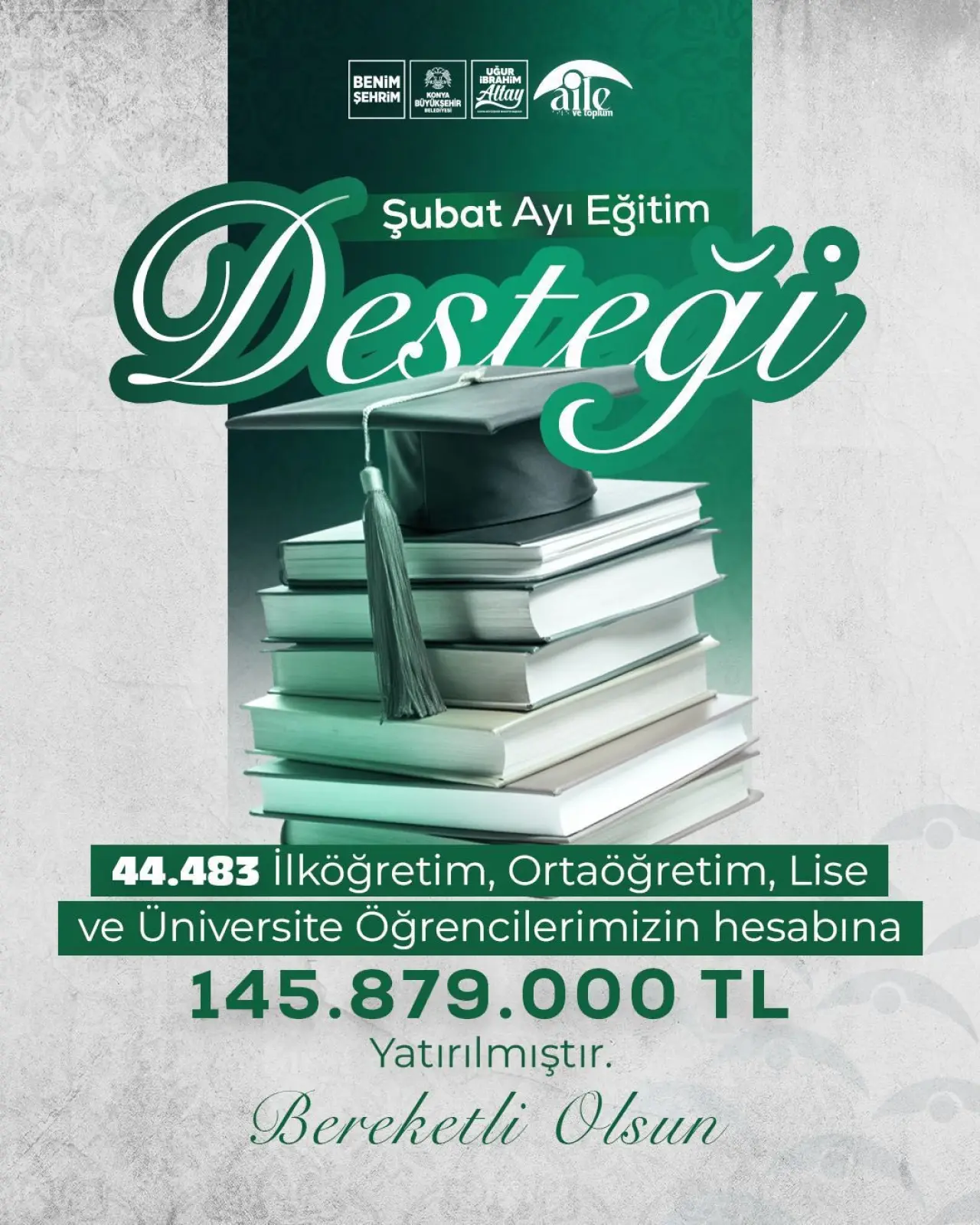 Konya Büyükşehir Belediyesi tarafından yürütülen destek programı kapsamında; ilkokul, ortaokul, lise ve üniversite düzeyinde eğitim gören toplam 44 bin 483 öğrencinin hesabına 145 milyon 879 bin TL aktarıldı.