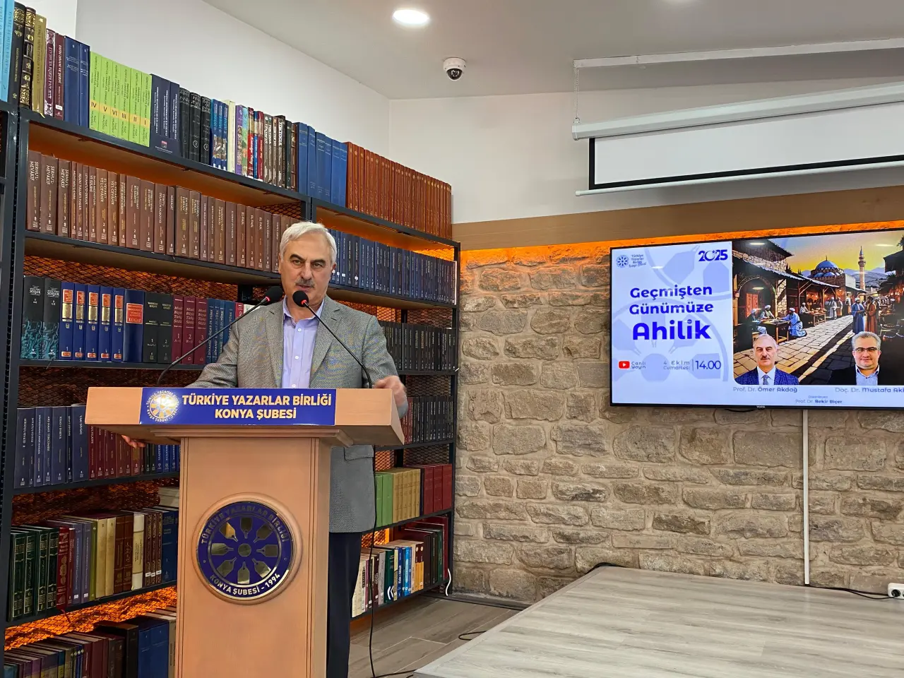 Türkiye Yazarlar Birliği (TYB) Konya Şubesi, Kültürel Etkinlikler serisi kapsamında düzenlenen “Geçmişten Günümüze Ahilik” programına ev sahipliği yaptı. Prof. Dr. Bekir Biçer’in yönetiminde, TYB Konya Şubesi D. Mehmet Doğan Kütüphanesi’nde gerçekleştirilen etkinlikte, konuşmacı olarak Prof. Dr. Ömer Akdağ ve Doç. Dr. Mustafa Akkuş yer aldı.