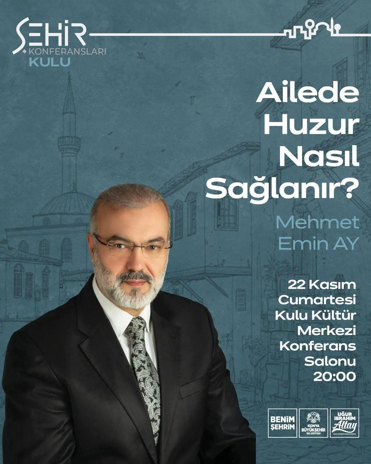 Aile bağlarının güçlendirilmesine yönelik önemli bir buluşma niteliği taşıyan programda, akademisyen ve yazar Mehmet Emin Ay aile huzurunun temellerini ele alacak. Konferansta; Ailede huzurun nasıl tesis edileceği, aile içi iletişimde dikkat edilmesi gereken unsurlar, günümüz koşullarında aile bireyleri arasında sağlıklı bağların nasıl korunacağı gibi konular detaylı şekilde işlenecek. Kulu Belediyesi, aile yapısının güçlenmesine katkı sunacak bu özel programa tüm Kulu Halkını davet etti.