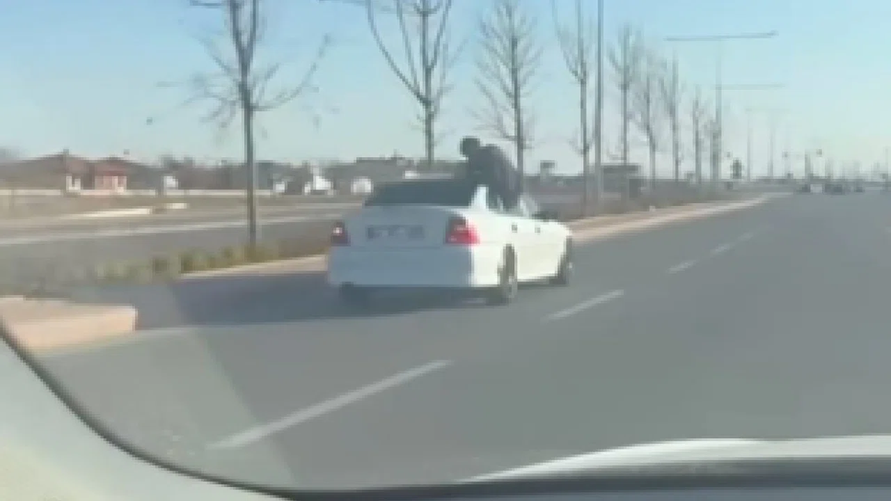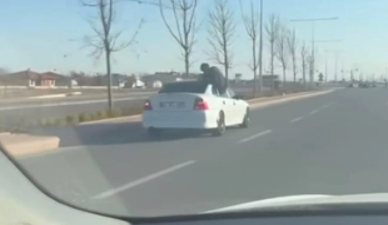 Görselde, beyaz renkli bir aracın hareket halinde olduğu ve içerisindeki bir kişinin camdan dışarı çıkarak aracın üzerine doğru tehlikeli bir şekilde sarktığı görülüyor. Söz konusu olay, trafiği tehlikeye attığı gibi, araç içerisindeki şahsın can güvenliği açısından da büyük risk taşıyor. Bu tür kontrolsüz hareketlerin hem sürücülerin dikkatini dağıttığı hem de kazalara davetiye çıkardığı biliniyor.