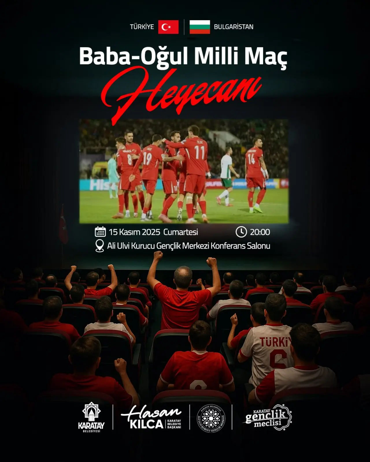 Karatay Belediyesi, A Millî Futbol Takımımızın Bulgaristan ile oynayacağı karşılaşmayı baba–oğul el ele, salon atmosferinde izlemek isteyen vatandaşlar için özel bir etkinlik düzenliyor.