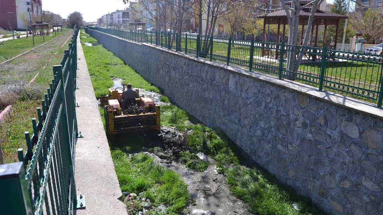 Konya'nın Cihanbeyli ilçesinde belediye ekipleri haşereyle mücadele çalışmaları yürütürken, diğer taraftan ilçe merkezinden geçen kanalda temizliğe başladı.