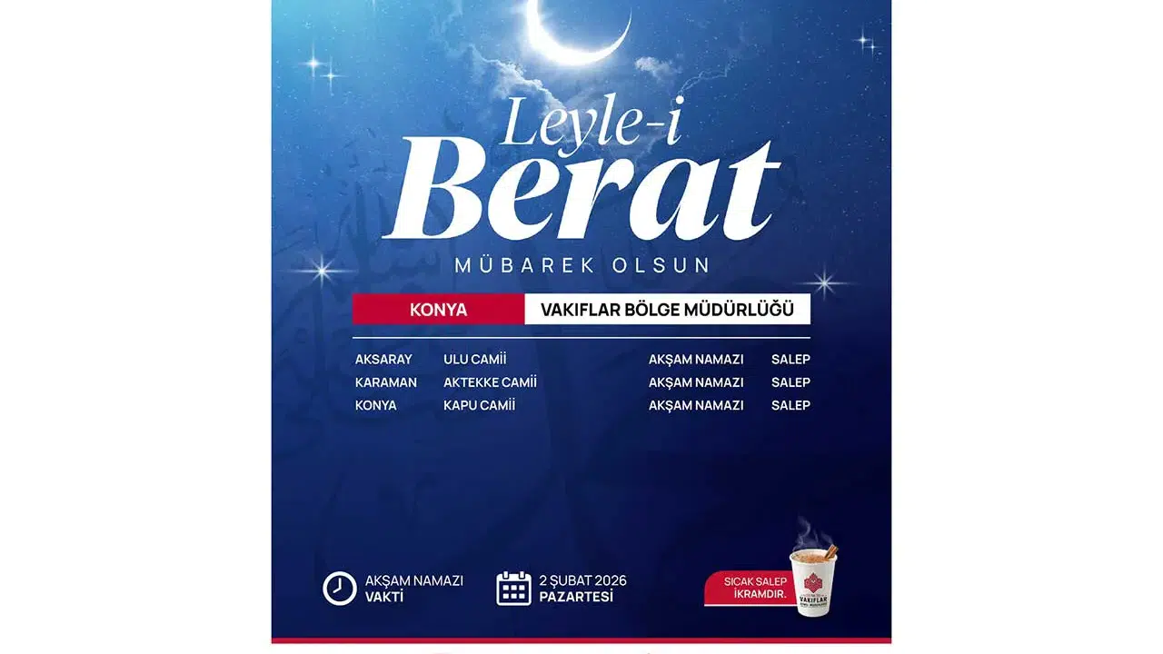 Konya Vakıflar Bölge Müdürlüğü, Leyle-i Berat dolayısıyla yapılacak ikram programına ilişkin açıklamada bulundu. Kültür ve Turizm Bakanlığı Vakıflar Genel Müdürlüğü tarafından yürütülen çalışmalar kapsamında, Berat Kandili vesilesiyle Konya, Aksaray ve Karaman illerinde vatandaşlara salep ikramı gerçekleştirileceği bildirildi.