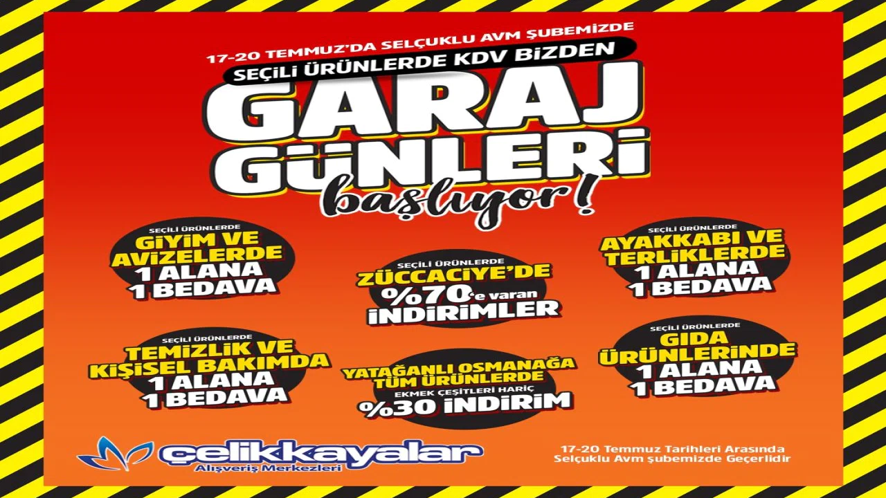 Çelikkayalar, Merkez AVM'de ses getiren "Garaj Günleri"ni şimdi de Selçuklu AVM'de tekrar ediyor. Tüketiciler, 17 Temmuz Perşembe'den 20 Temmuz Pazar'a kadar sürecek bu kampanya ile her kategoriden binlerce üründe inanılmaz indirimlere sahip olacak. Alışveriş tutkunlarının yüzünü güldürecek bu günler, cüzdanları da ferahlatacak.