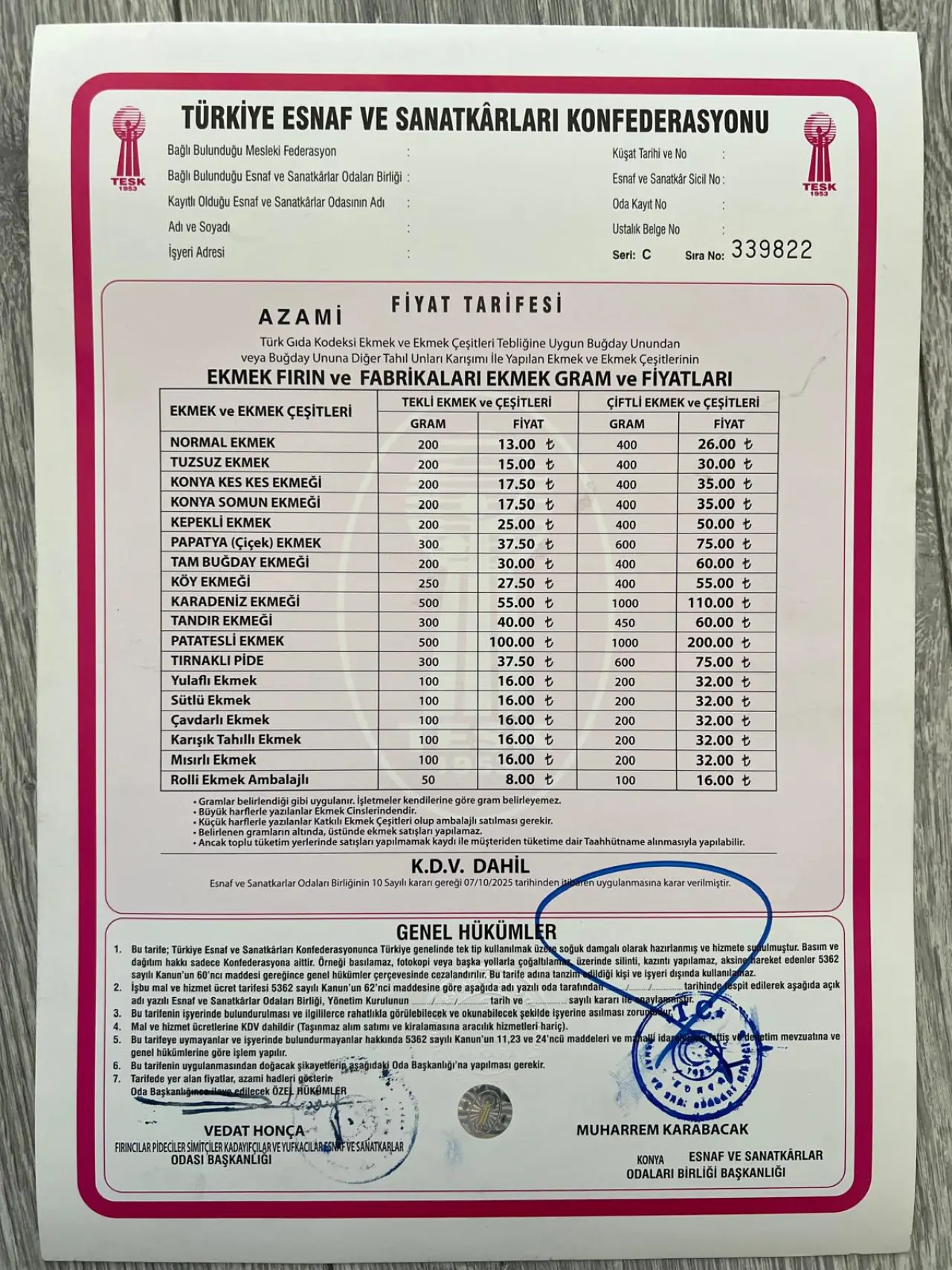 Konya’da ekmek fiyatları yeni tarifeyle güncellendi. Türkiye Esnaf ve Sanatkârları Konfederasyonu’nun (TESK) onayıyla Konya Fırıncılar Odası tarafından belirlenen azami fiyat listesi, 21 Ekim 2025 Salı gününden itibaren yürürlüğe girecek.
