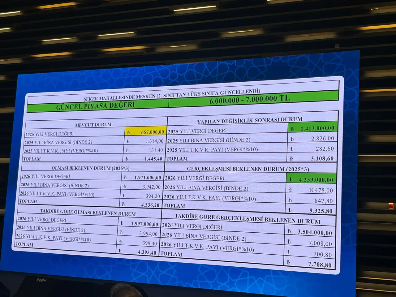 Getirilen sınırlamaya göre, arsa ve bina emlak vergisine esas değerlerin, 2025 yılındaki değerin iki katından fazla artışla en fazla üç katına kadar çıkarılabildiğini belirten Pekyatırmacı, bu konunun kamuoyunda yanlış anlaşıldığını ifade etti. Pekyatırmacı, “İki kat ilave yapılabilir deniyor. Yani bir lira olan değer en fazla üç liraya çıkarılabilir. Üç katın üzerinde artış yapılamaz. Bu durum Resmi Gazete’de yayımlanan genelgede tüm örnekleriyle açıkça belirtilmiştir” dedi.